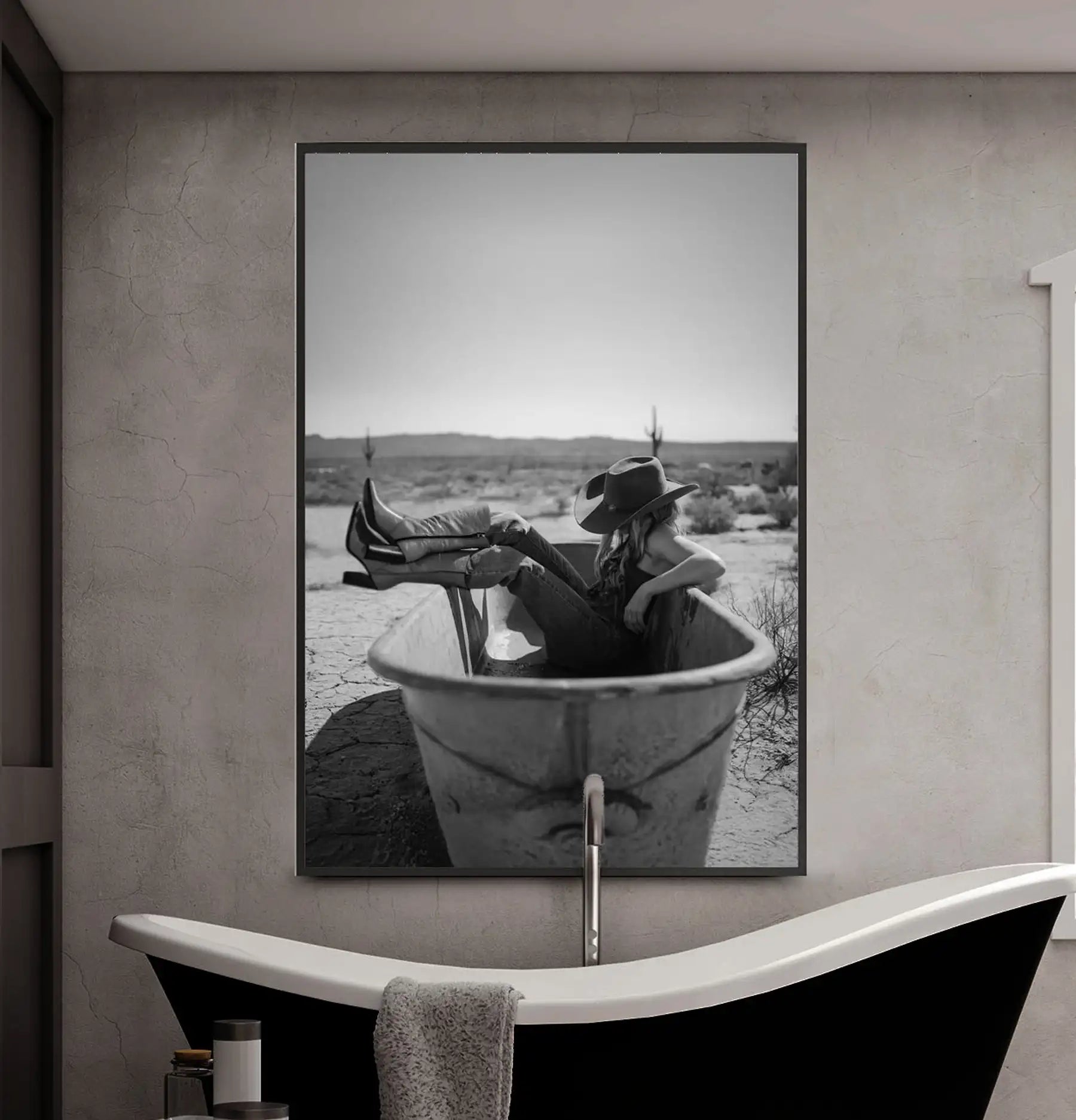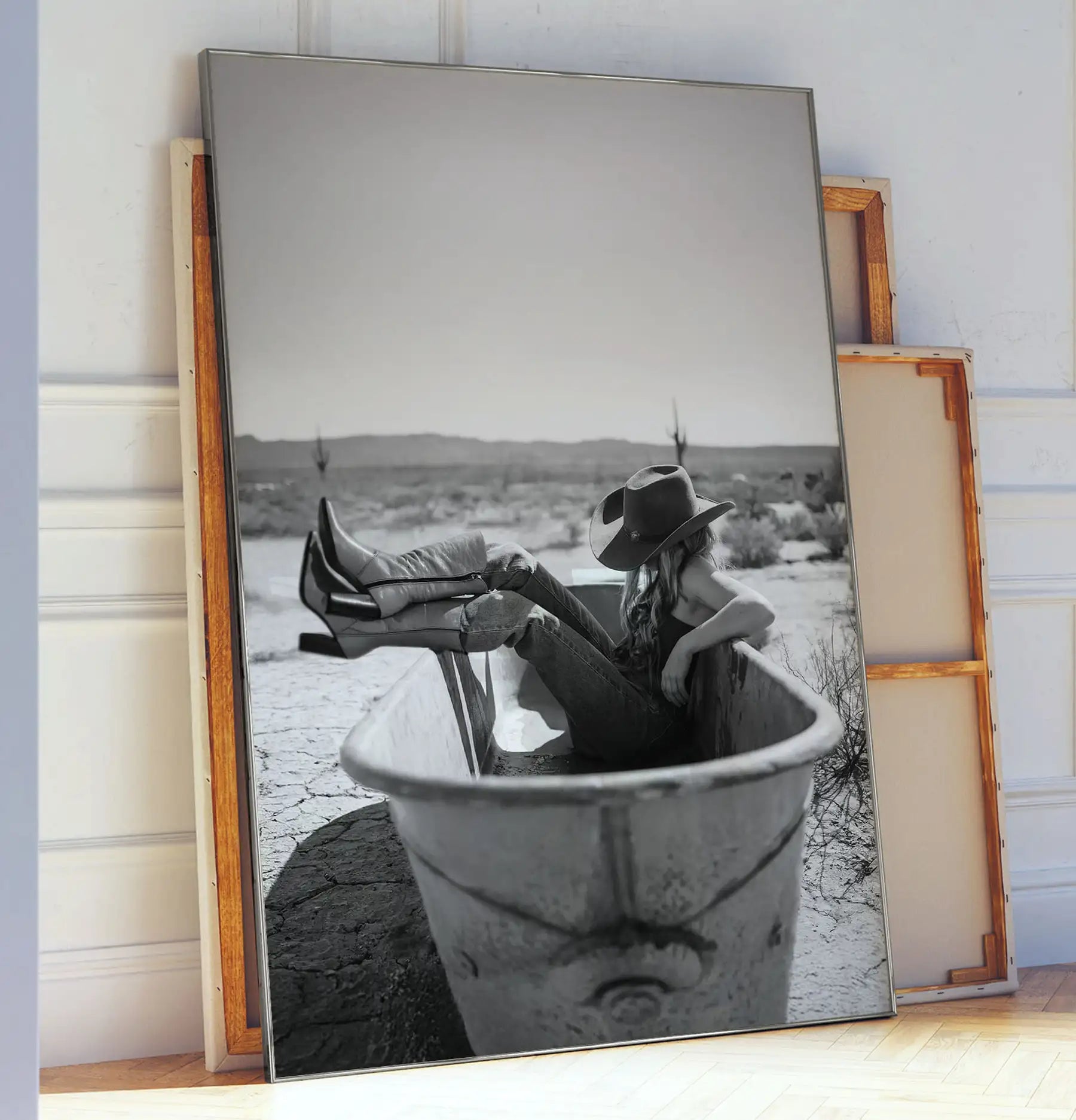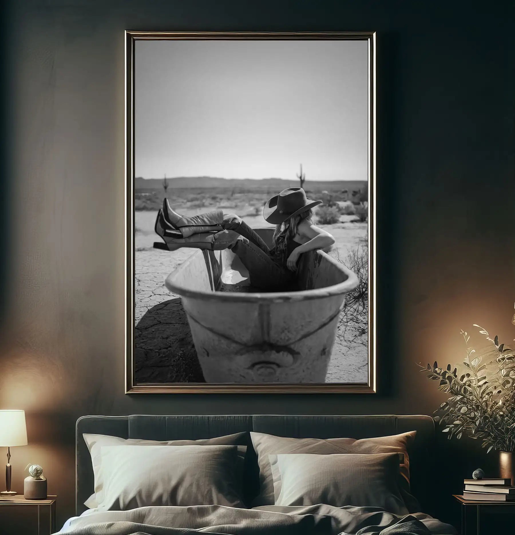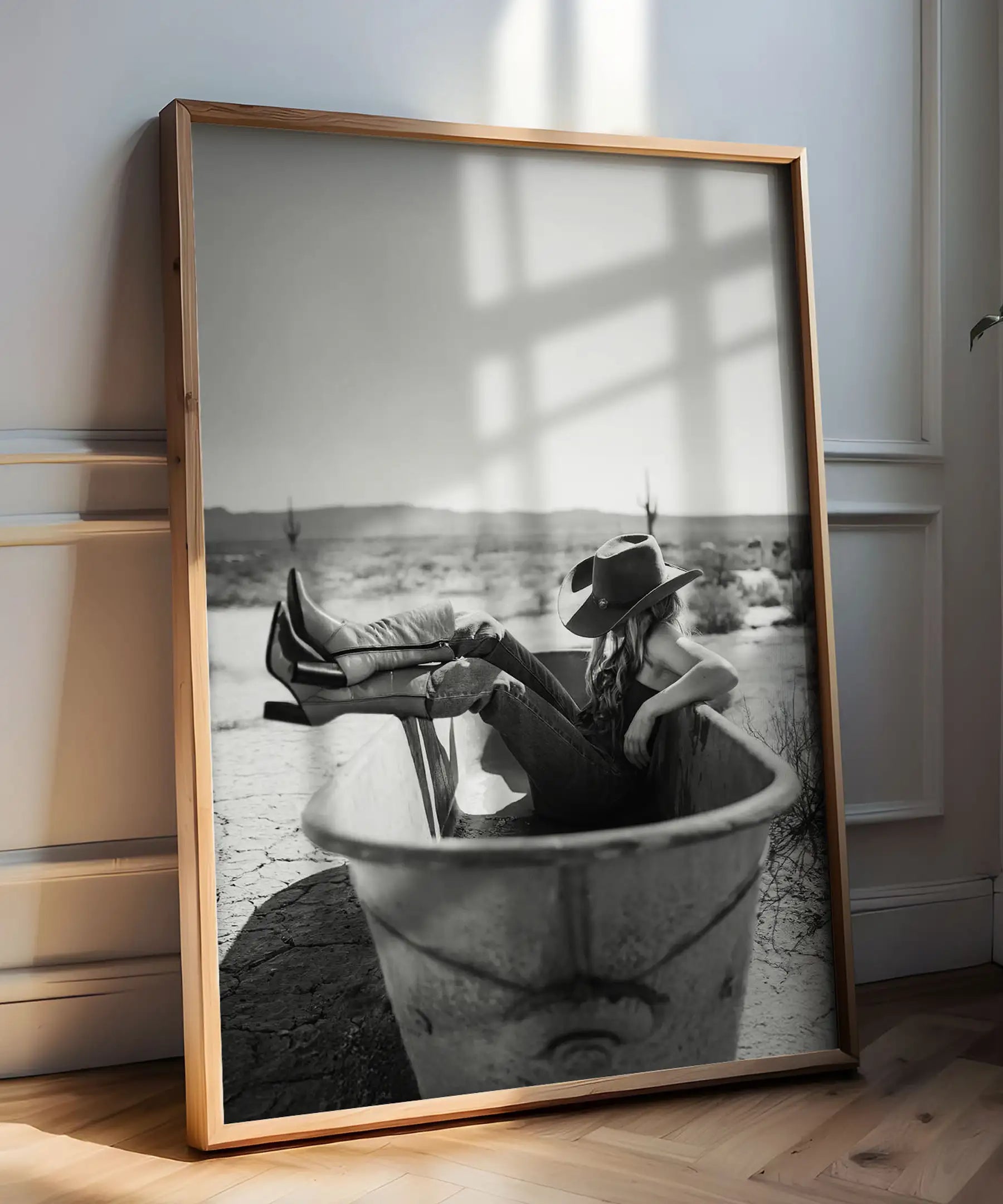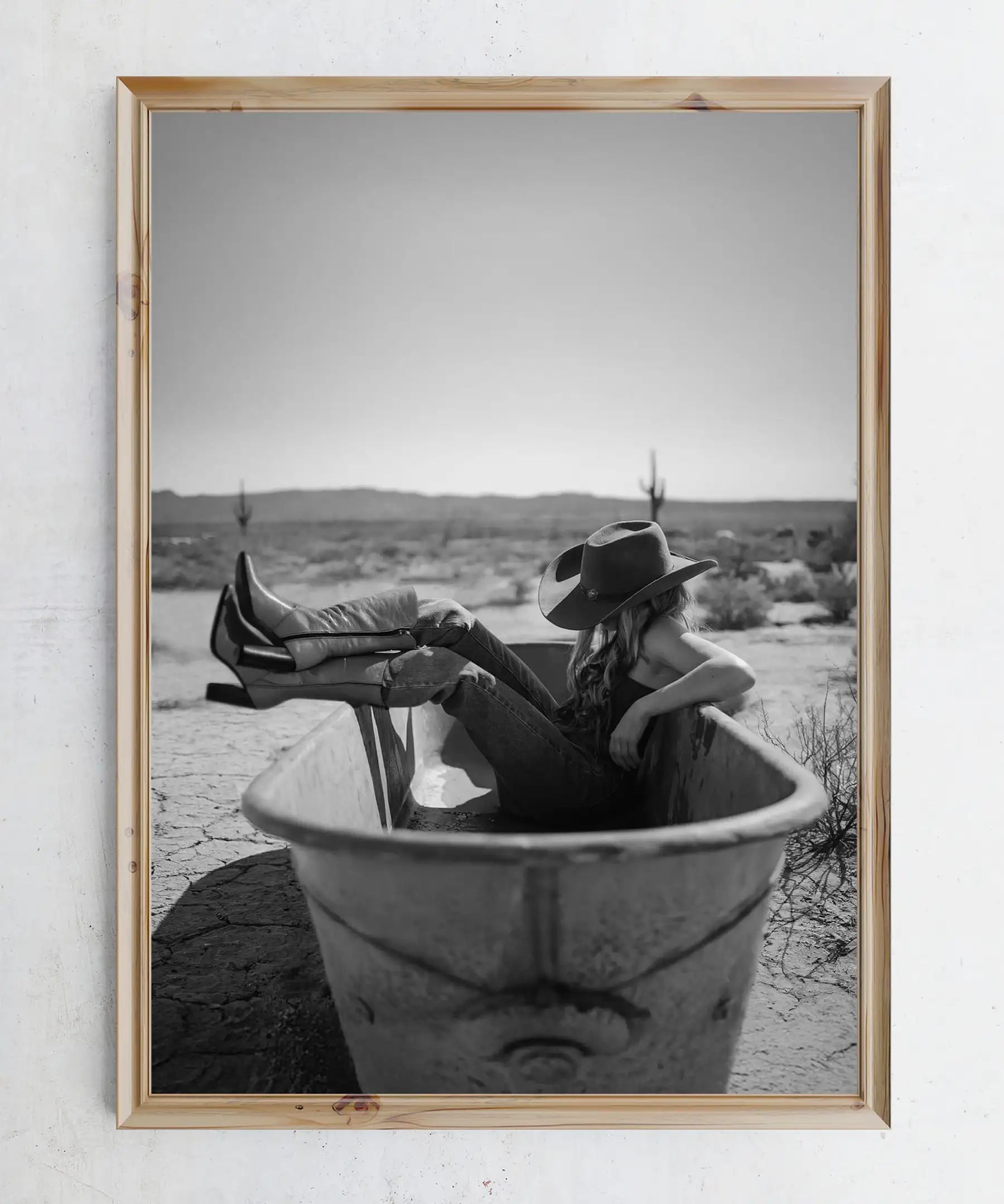Some days, you soak. Other days, you kick your boots up in the desert and call it therapy. This print captures pure Western nonchalance with a wink and a dust trail. Perfect for anyone who likes their solitude sun-drenched, and their decor unapologetically bold.
