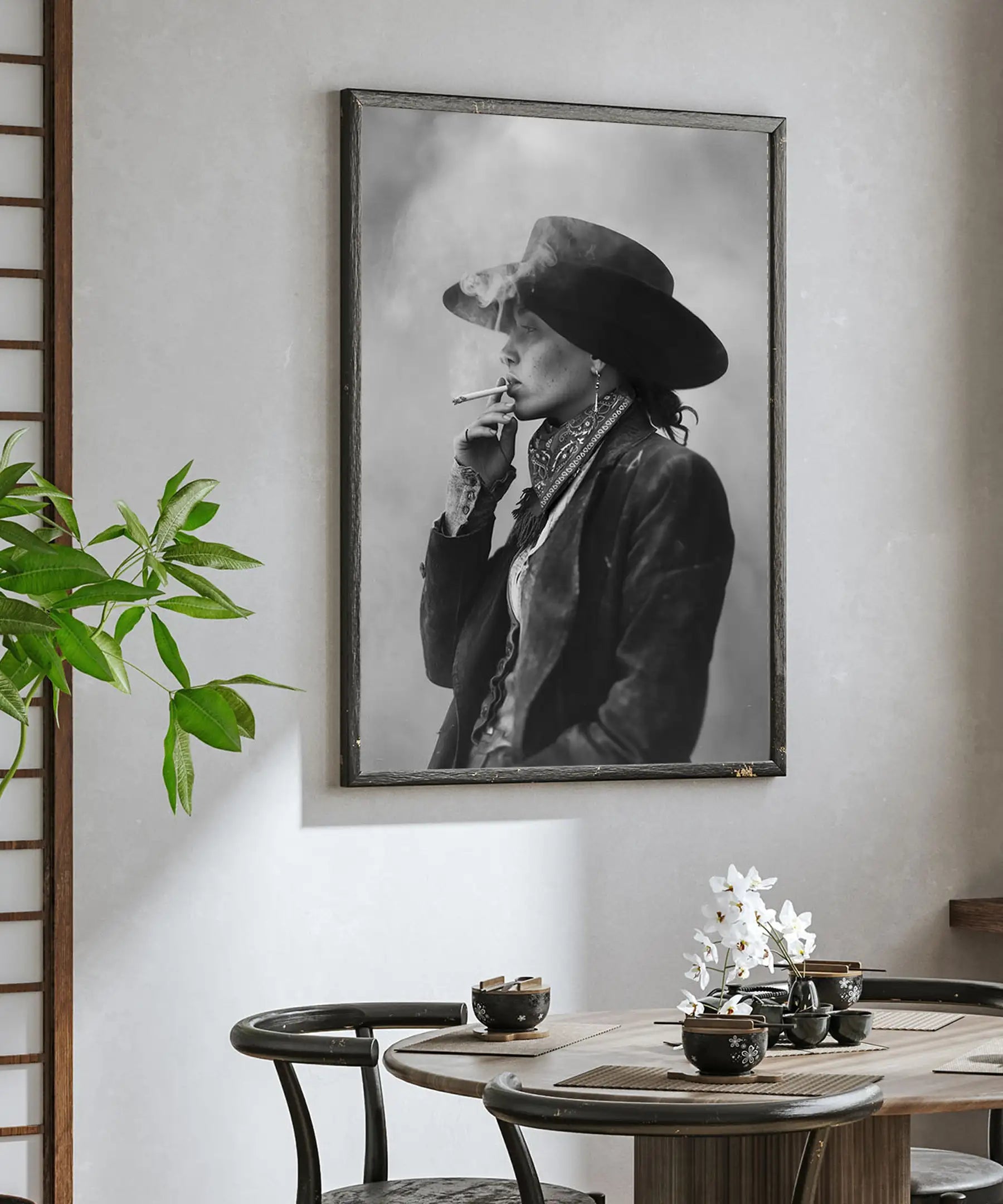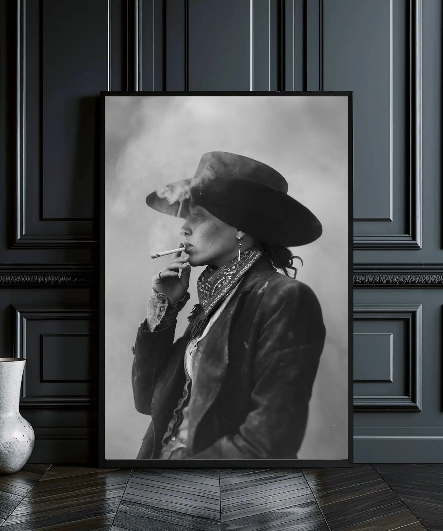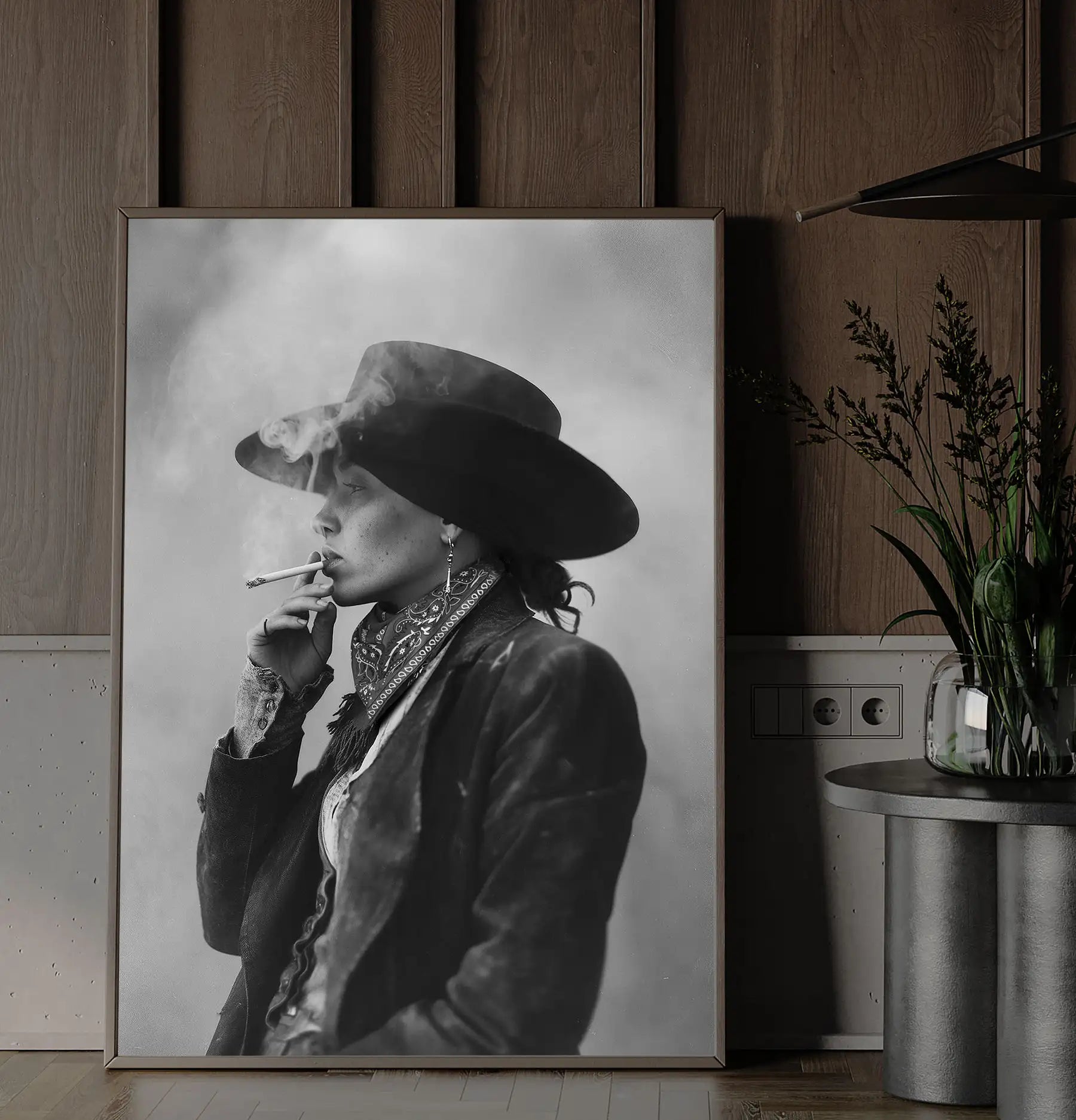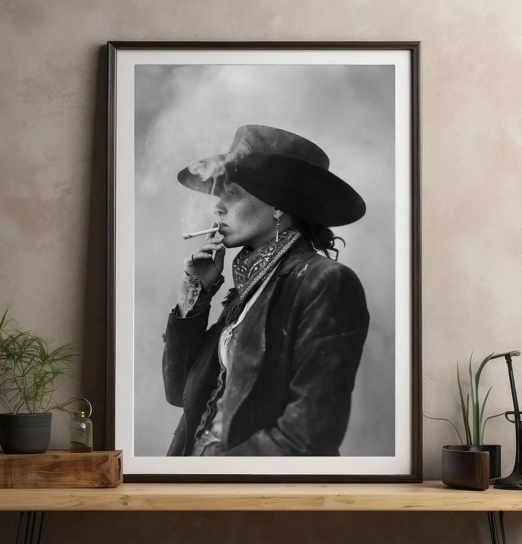 Perfect for bars, lounges, or anyone who likes their art with attitude and ash. This smoky standoff in a frame blends Western grit with vintage cool — a portrait of calm rebellion. Shot in crisp black-and-white and finished with just the right amount of swagger.