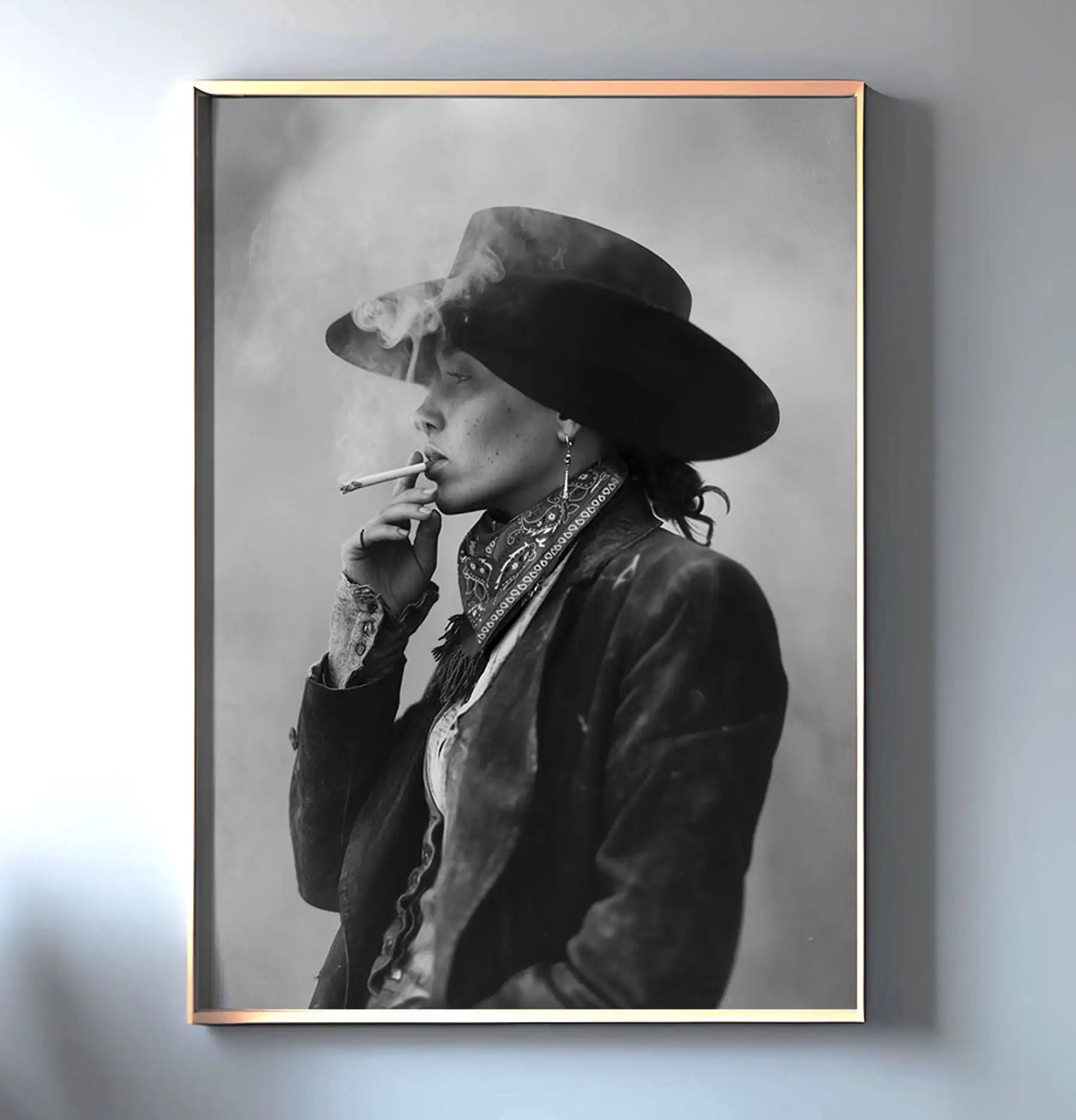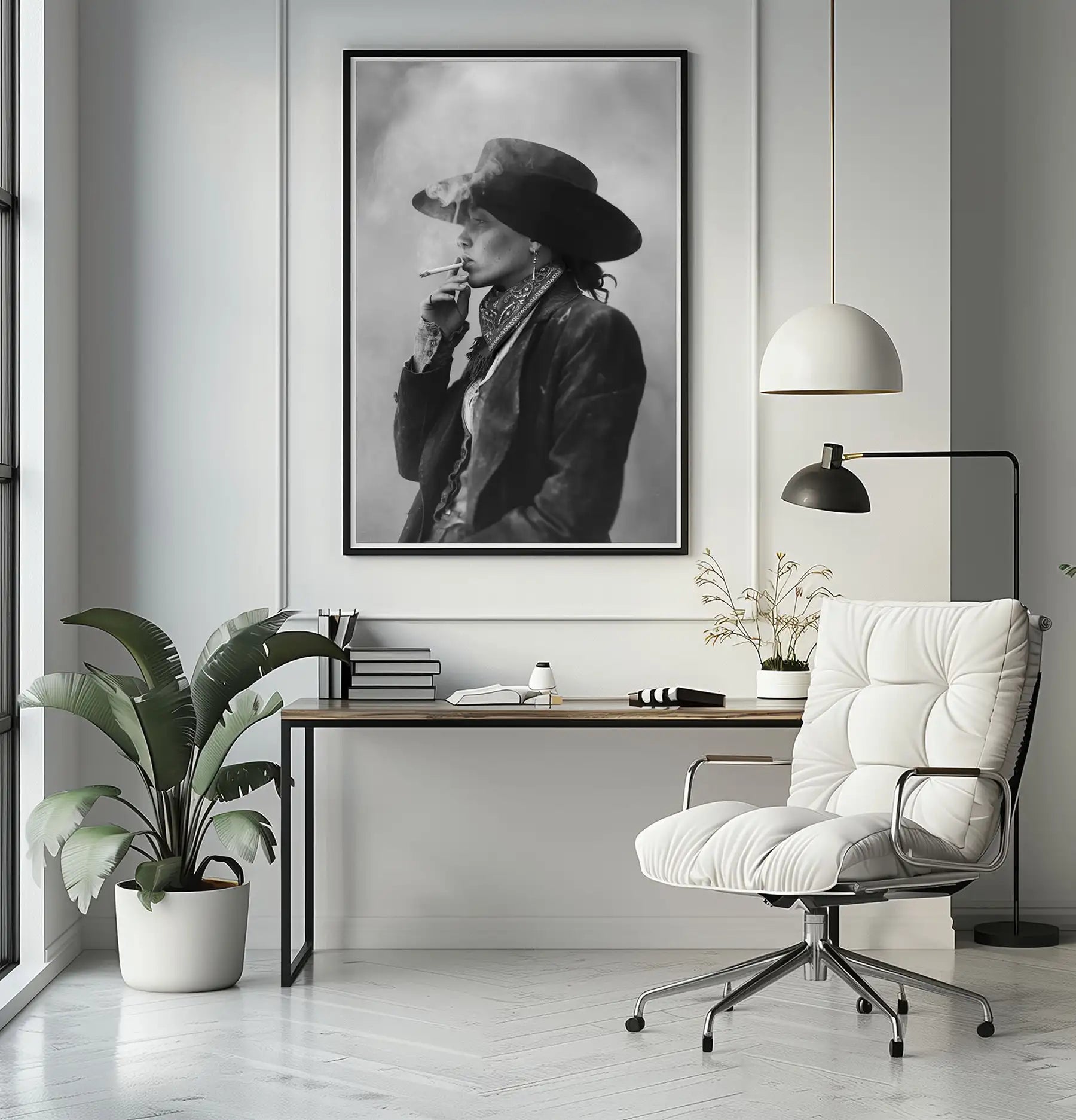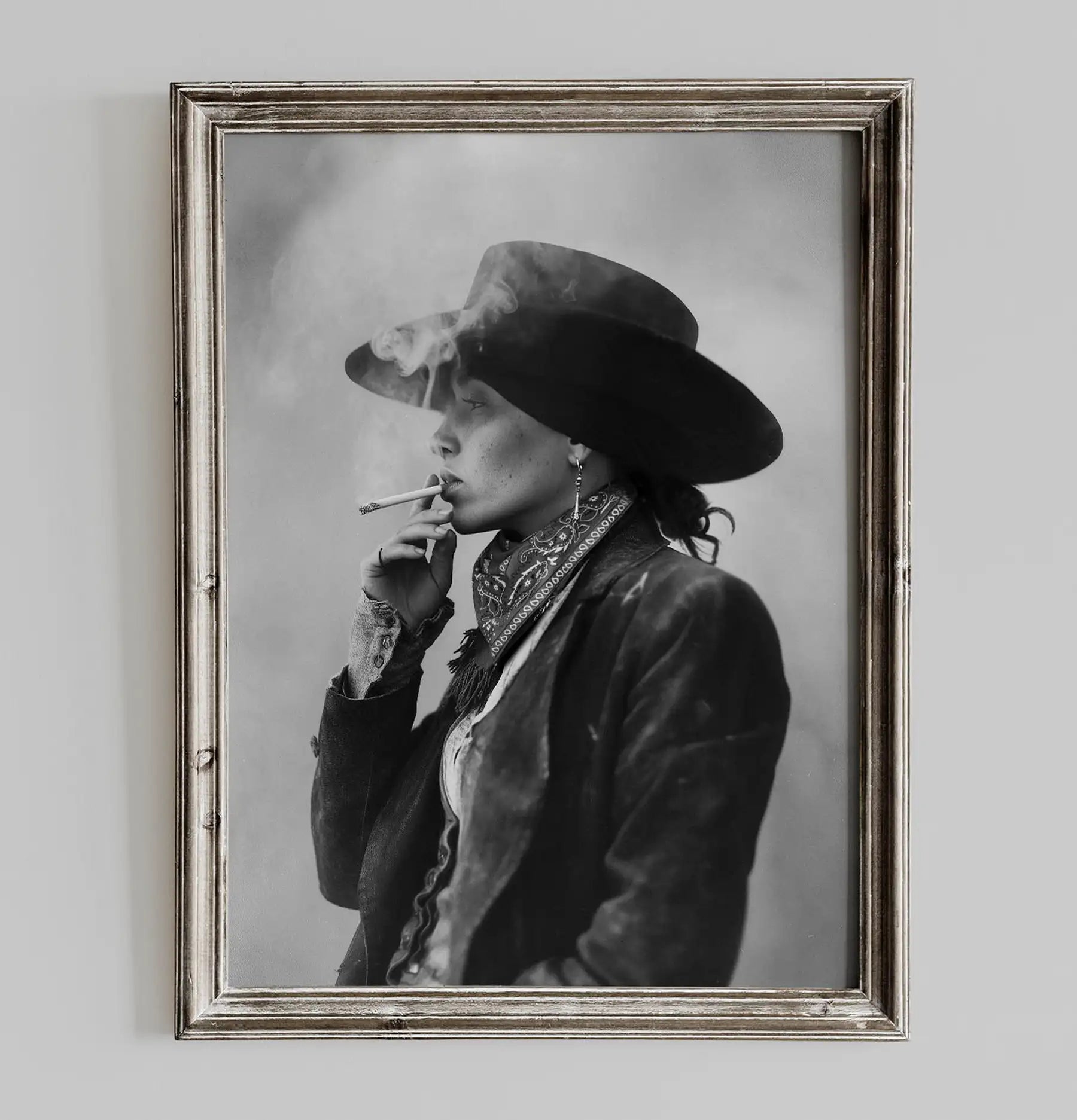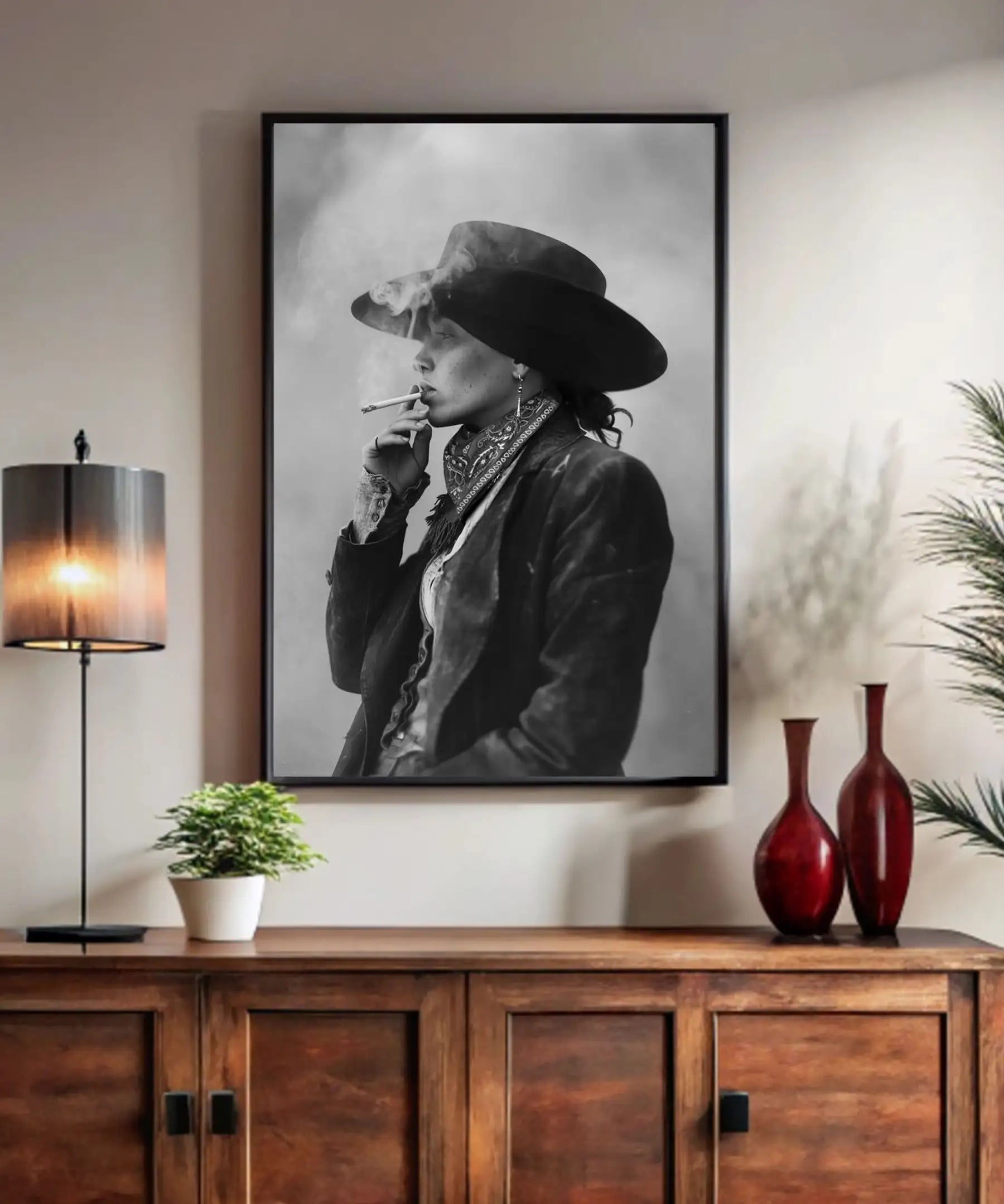 Perfect for bars, lounges, or anyone who likes their art with attitude and ash. This smoky standoff in a frame blends Western grit with vintage cool — a portrait of calm rebellion. Shot in crisp black-and-white and finished with just the right amount of swagger.