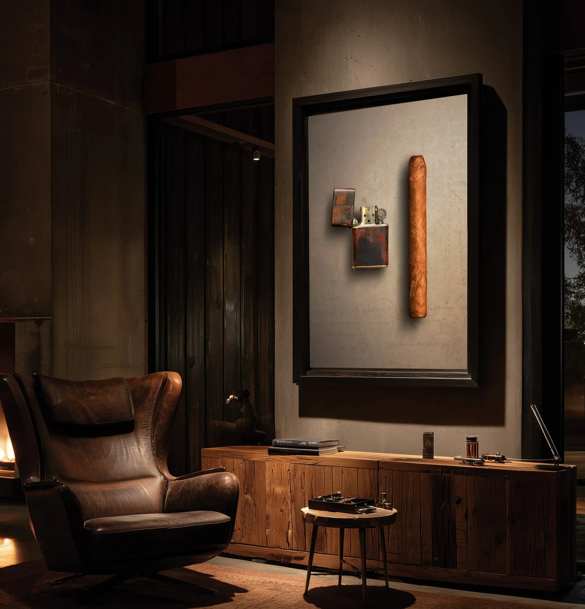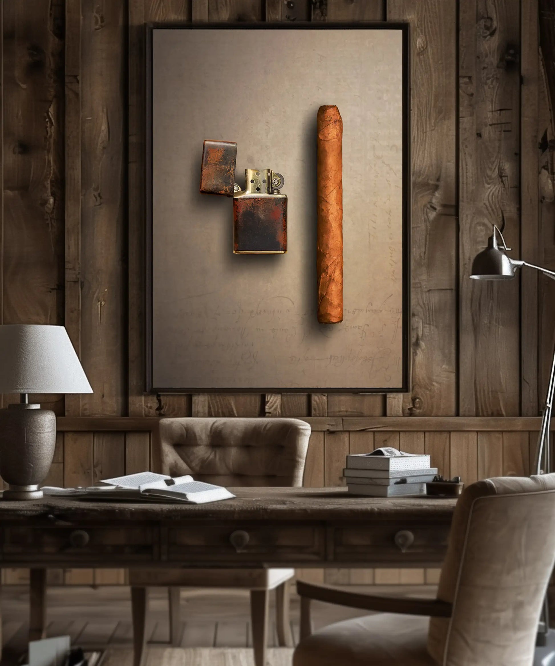 Some things just belong together — like a well-aged cigar and a trusty old lighter. This minimalist print keeps it simple and striking, with a touch of rust and rebellion. Perfect for bar carts, lounges, or anyone who respects the ritual. It’s not just wall art — it’s a mood.
