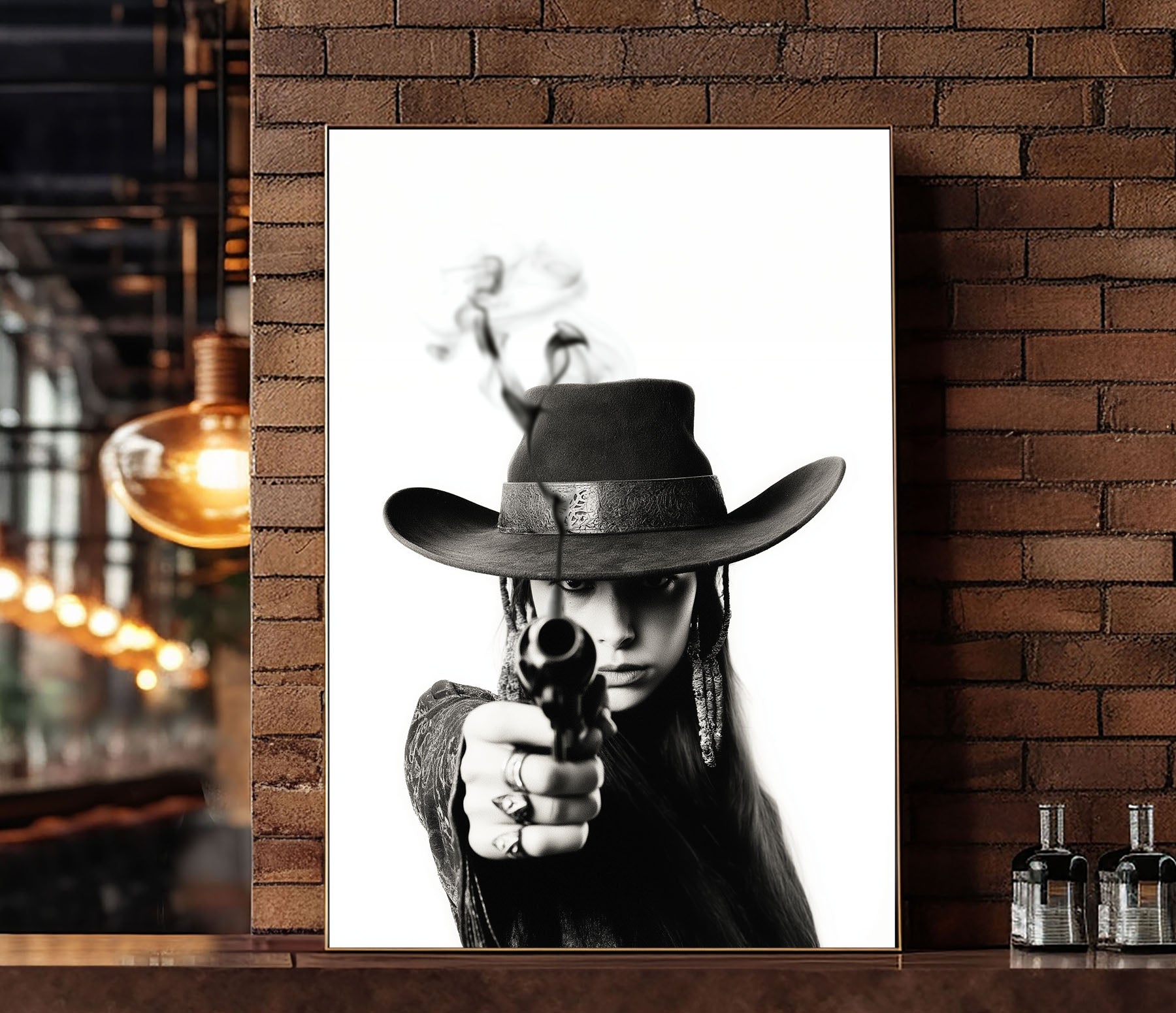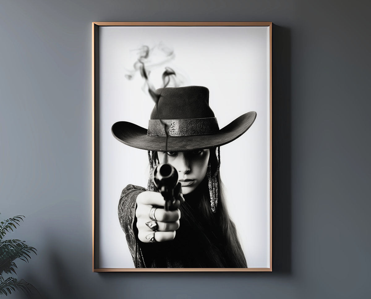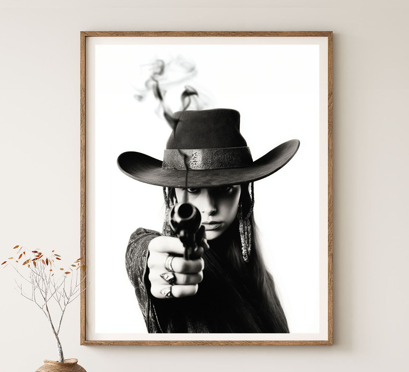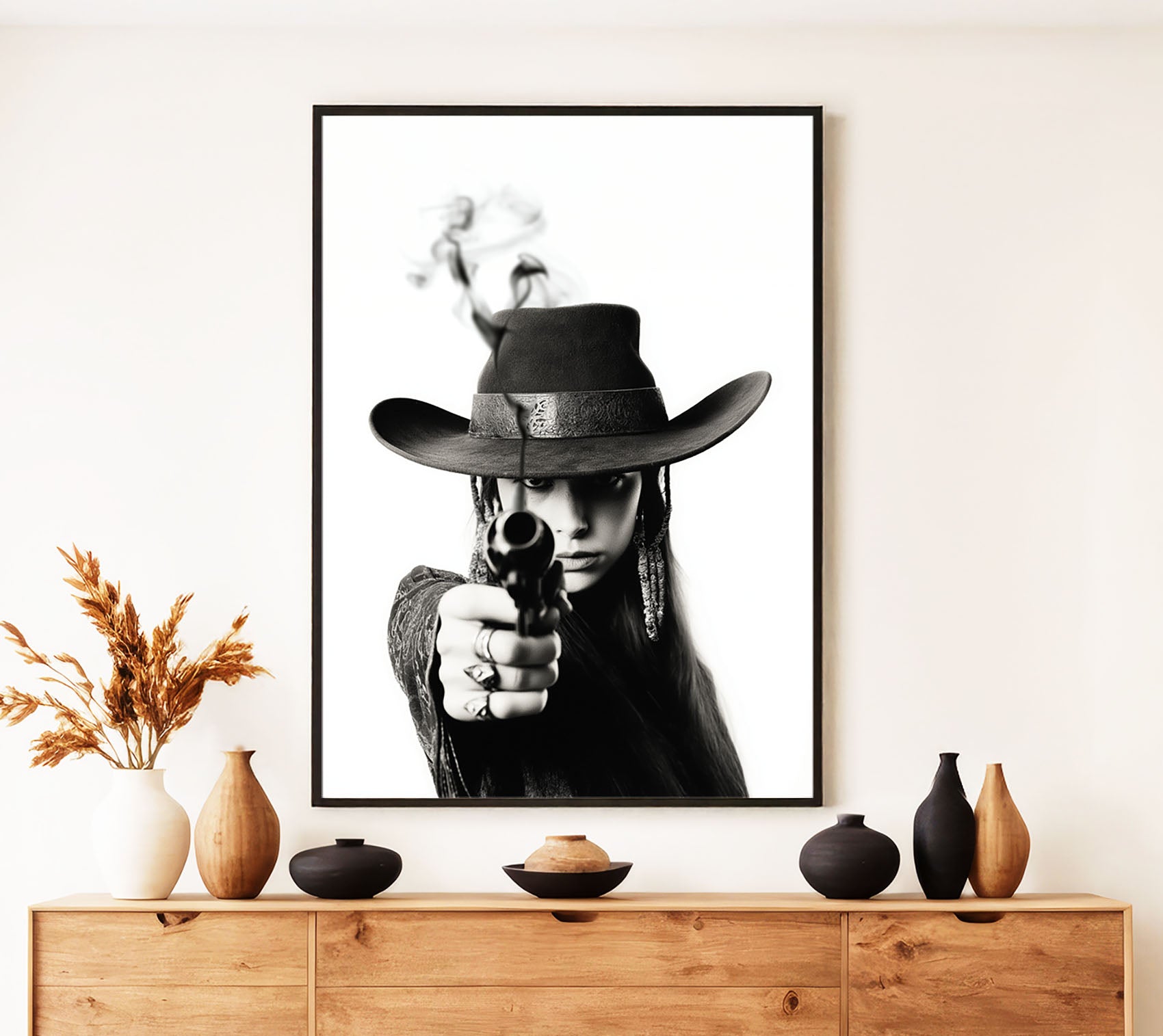 She’s not aiming to impress — just aiming. This bold black-and-white print captures a fierce cowgirl mid-standoff, smoke still curling from the barrel. Grit, grace, and a don’t-mess-with-me stare make it a statement piece for anyone who appreciates strong women and stronger decor.
