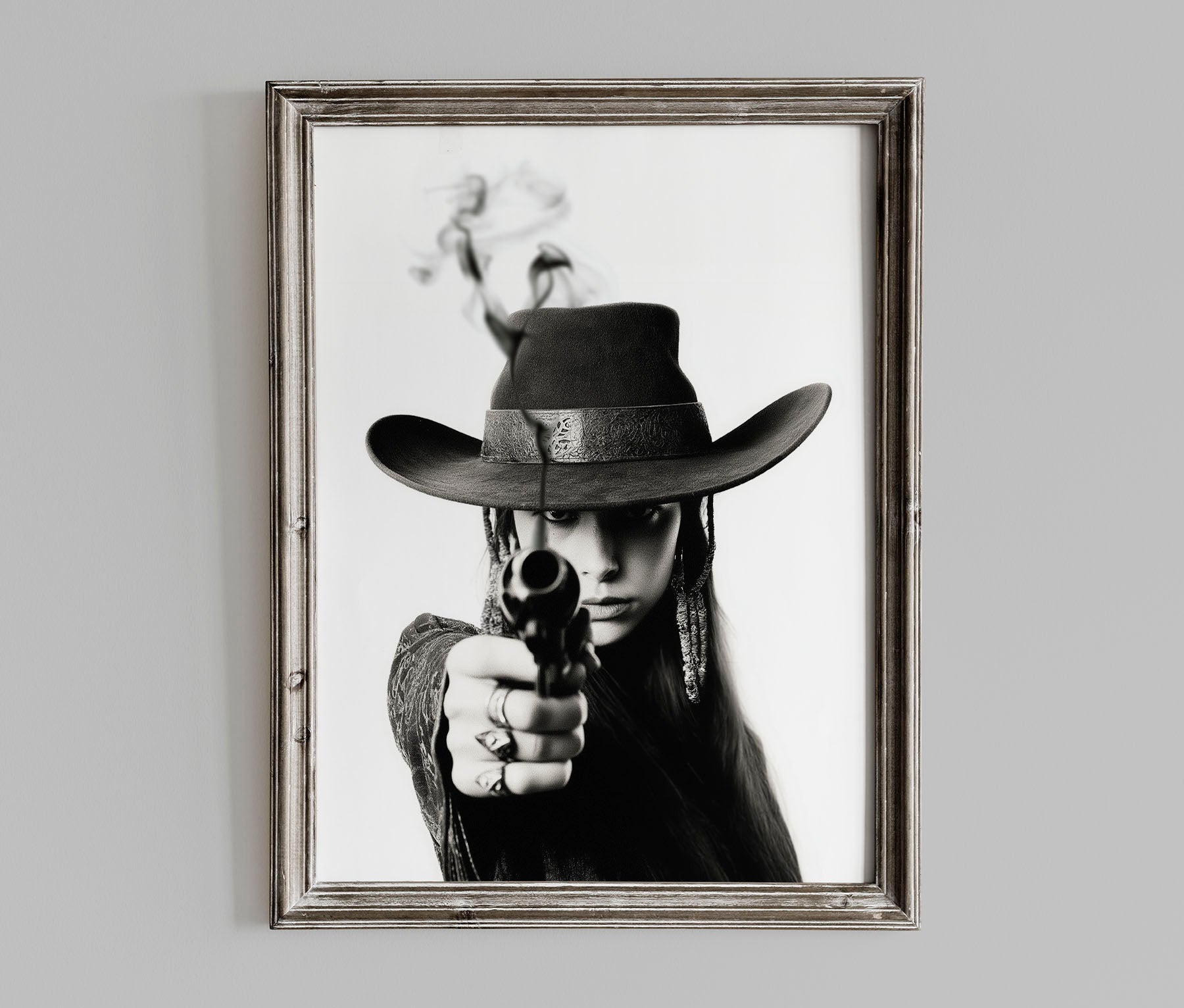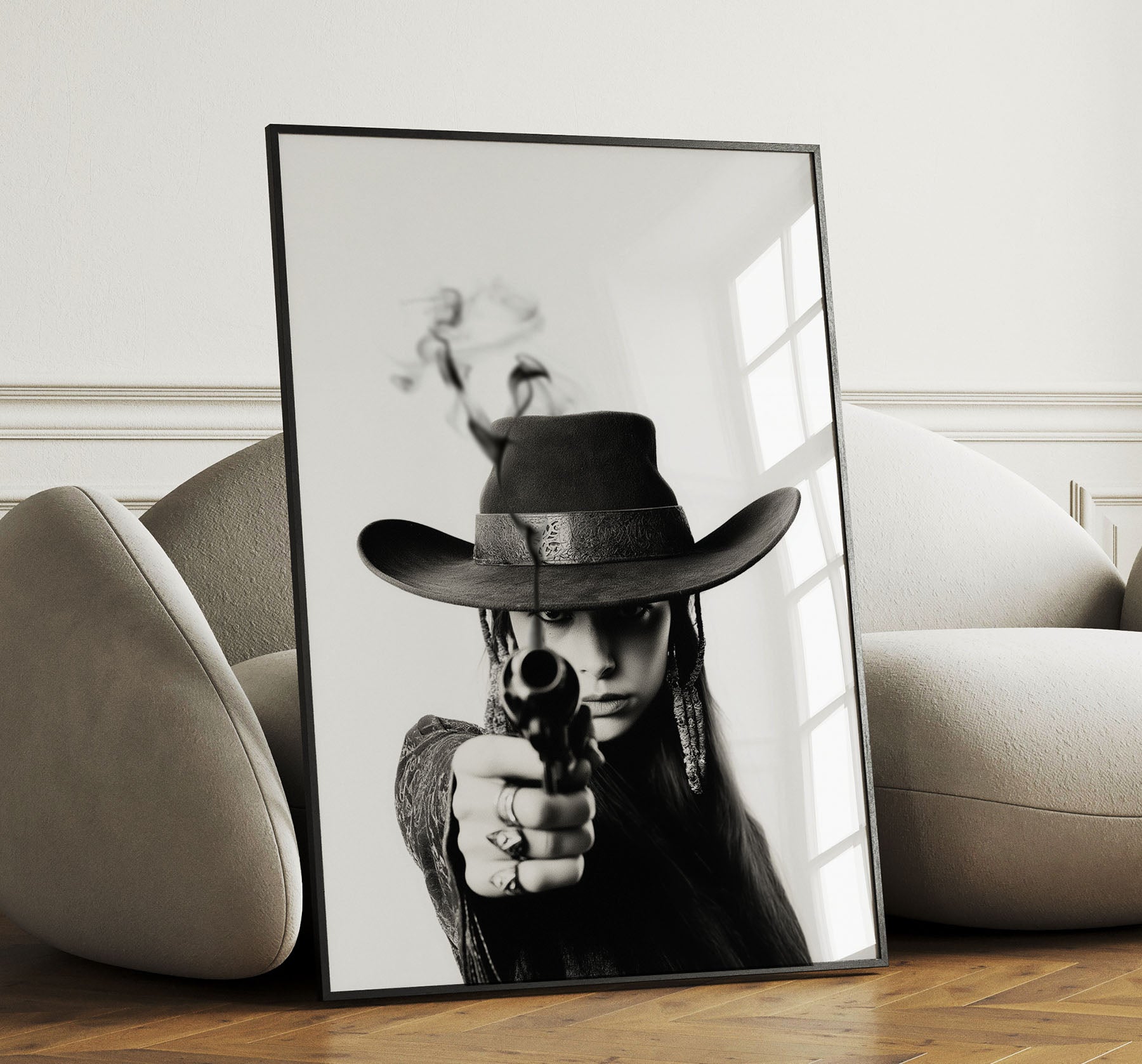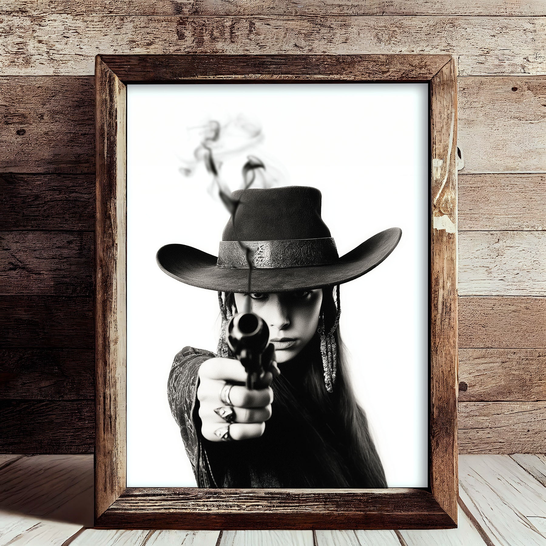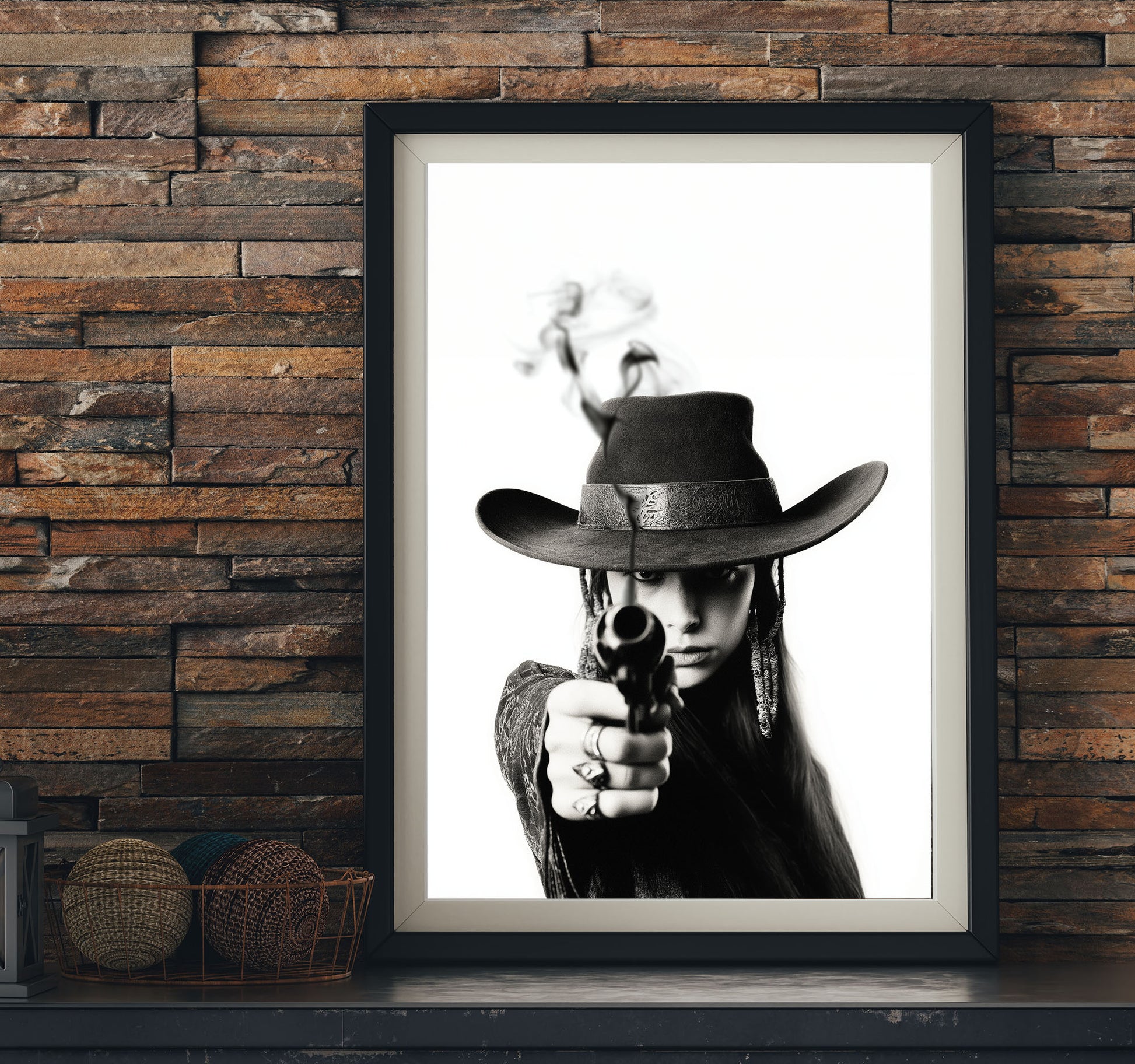 She’s not aiming to impress — just aiming. This bold black-and-white print captures a fierce cowgirl mid-standoff, smoke still curling from the barrel. Grit, grace, and a don’t-mess-with-me stare make it a statement piece for anyone who appreciates strong women and stronger decor.