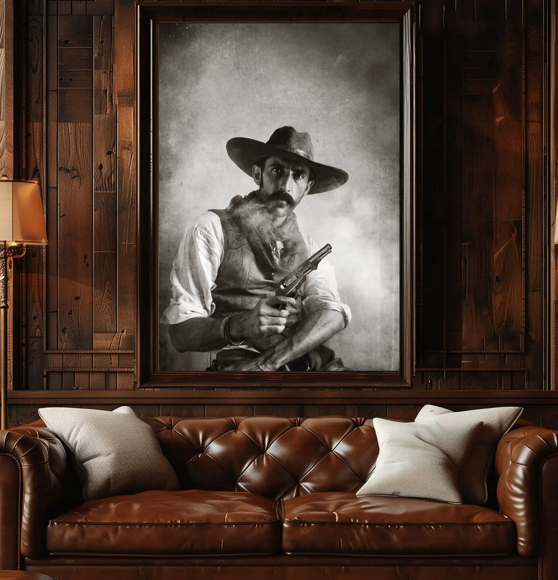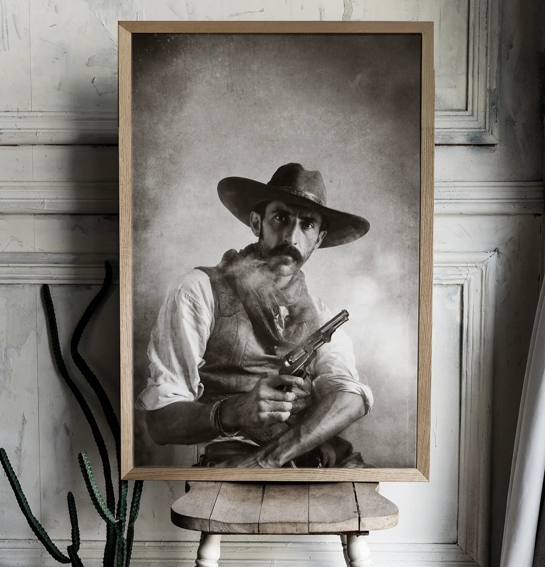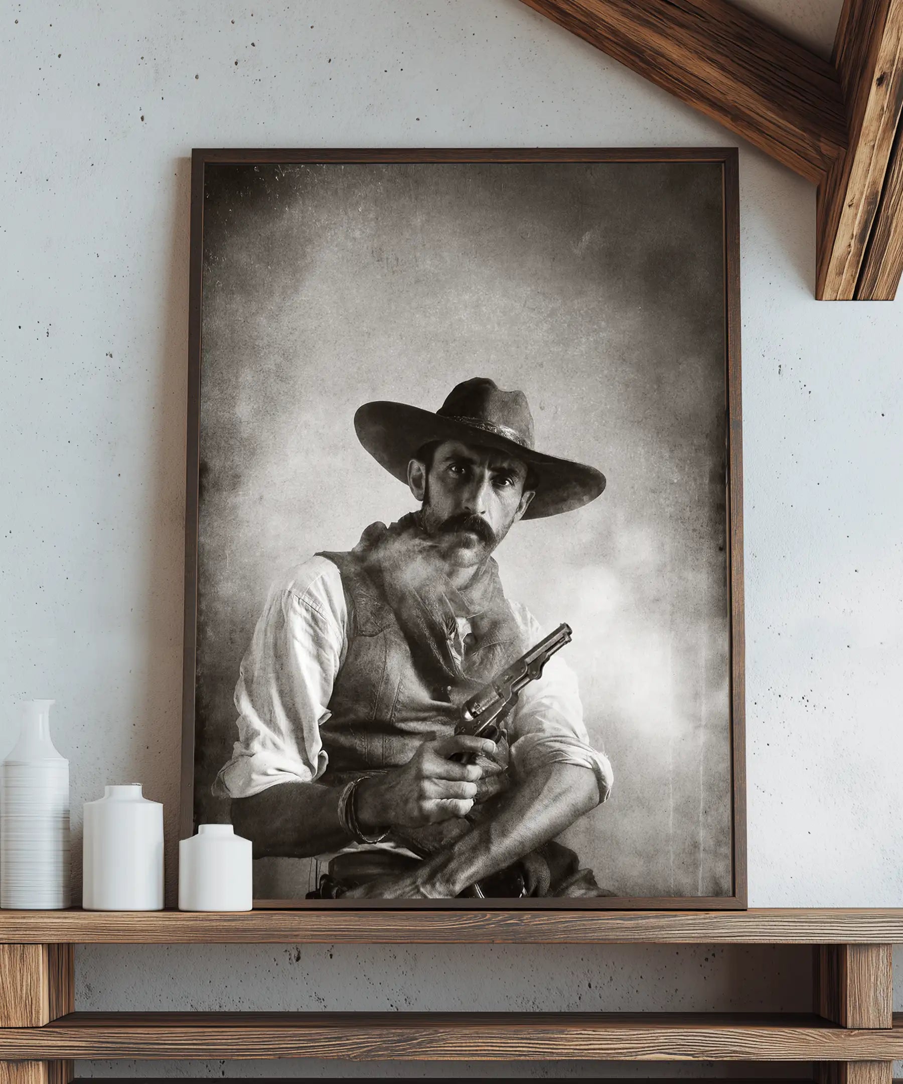 He’s not smiling, and that’s probably for the best. Smoke still lingers in the air, and nobody’s asking questions. This Western portrait captures grit, swagger, and just enough heat to start a barroom story. Printed with vintage texture for full outlaw energy — perfect for walls that don’t play nice.