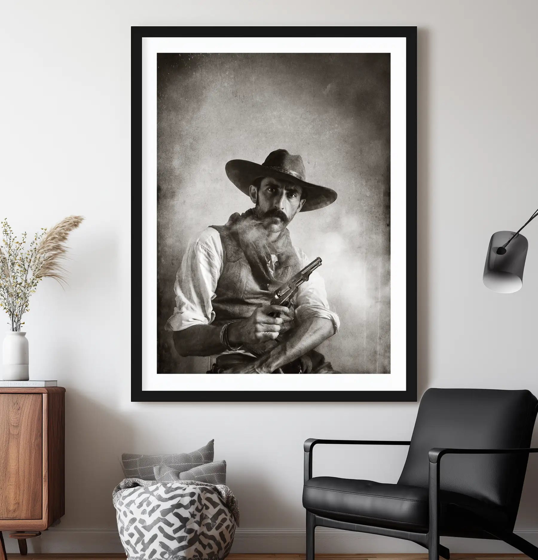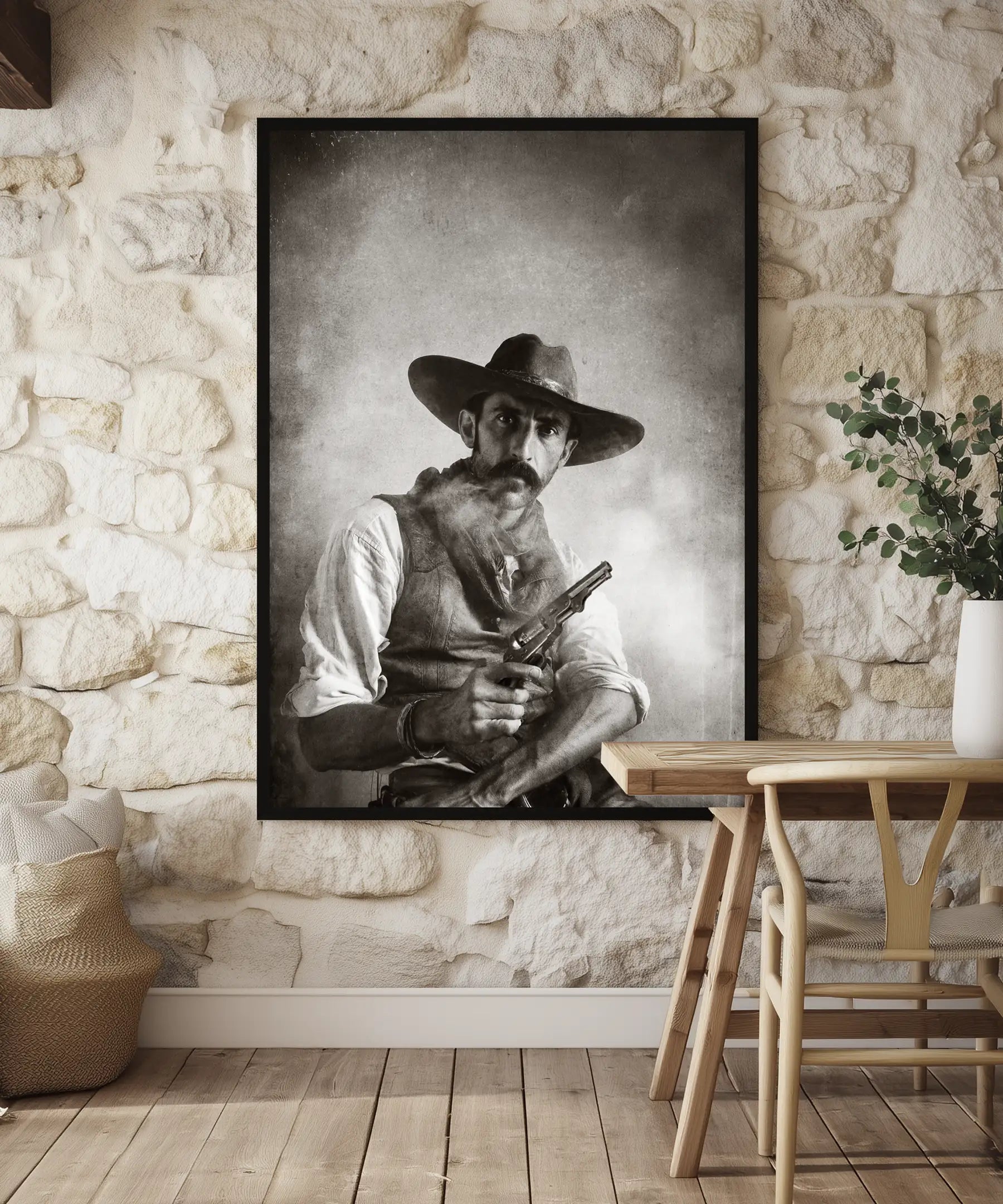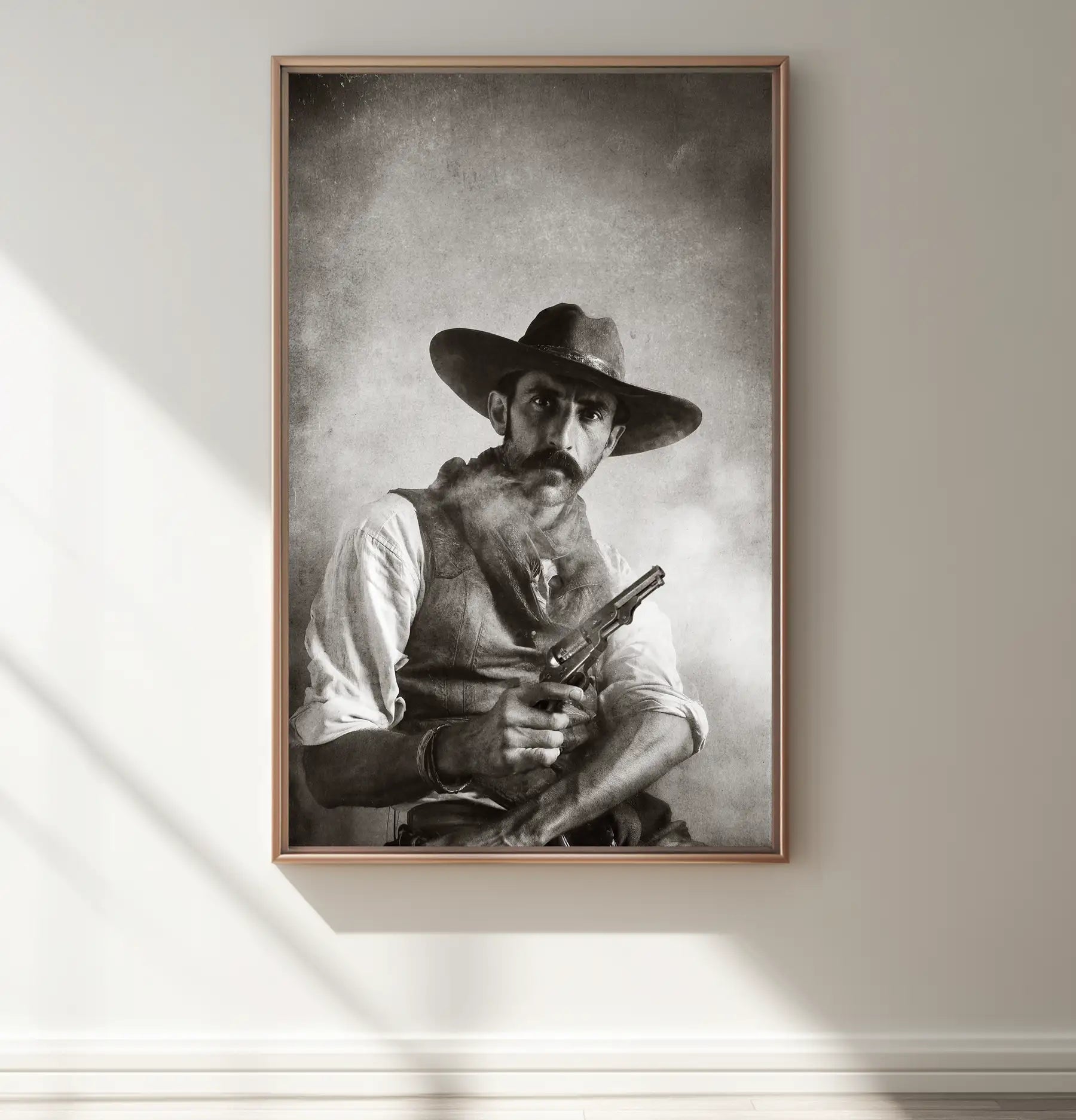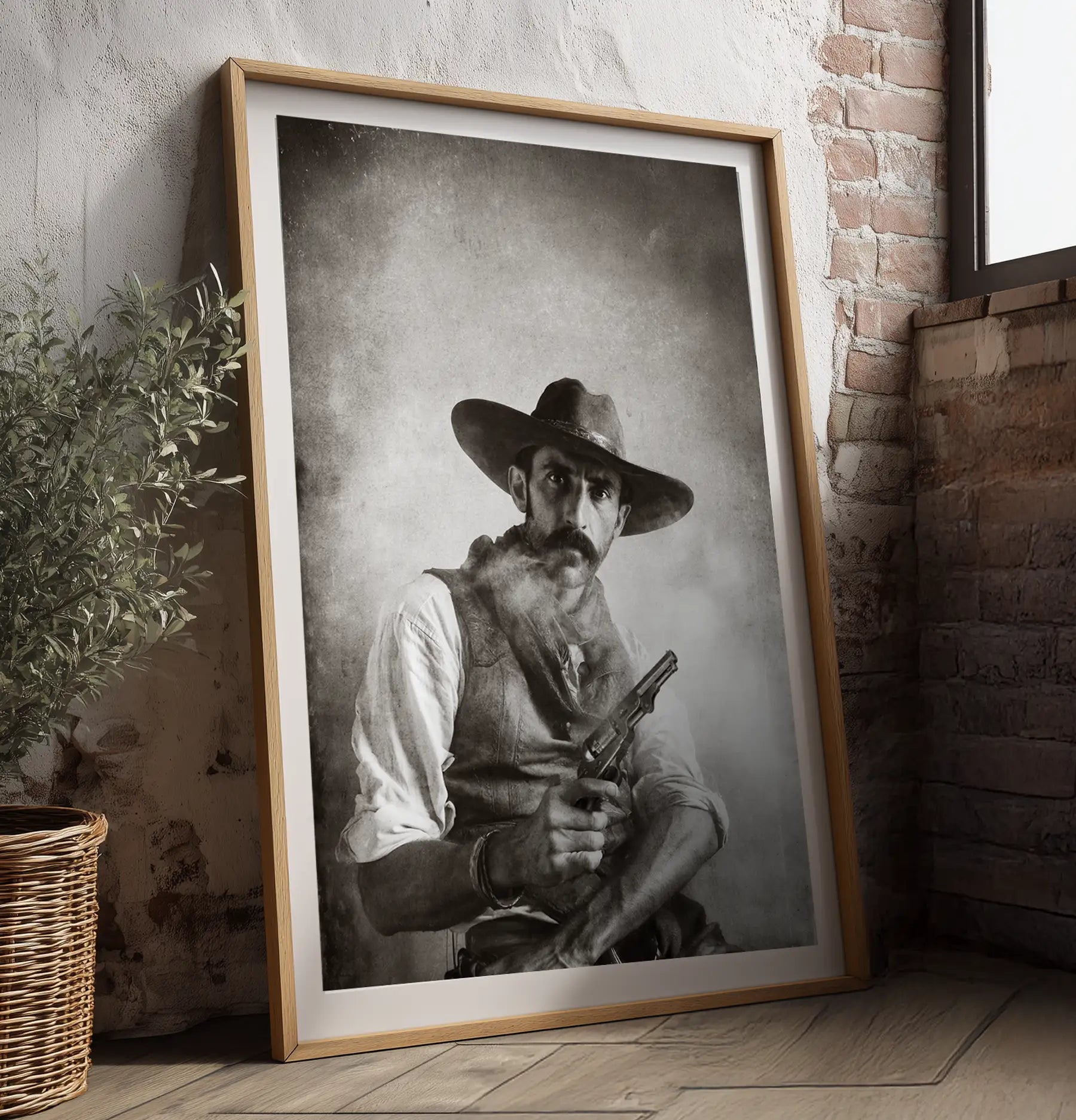 He’s not smiling, and that’s probably for the best. Smoke still lingers in the air, and nobody’s asking questions. This Western portrait captures grit, swagger, and just enough heat to start a barroom story. Printed with vintage texture for full outlaw energy — perfect for walls that don’t play nice.