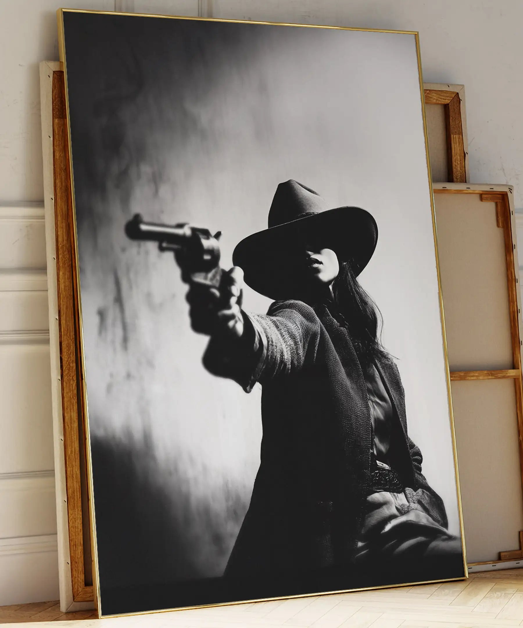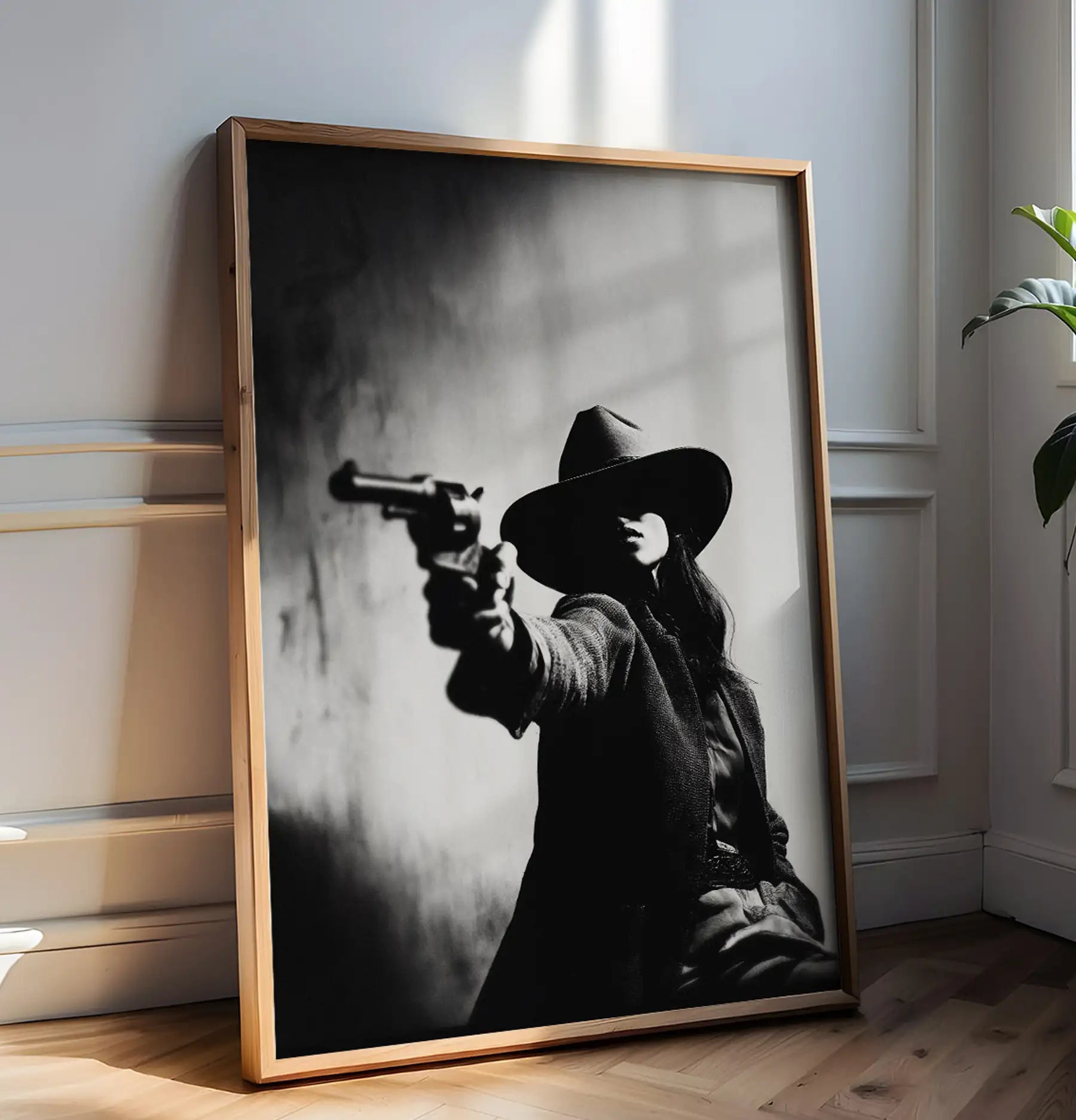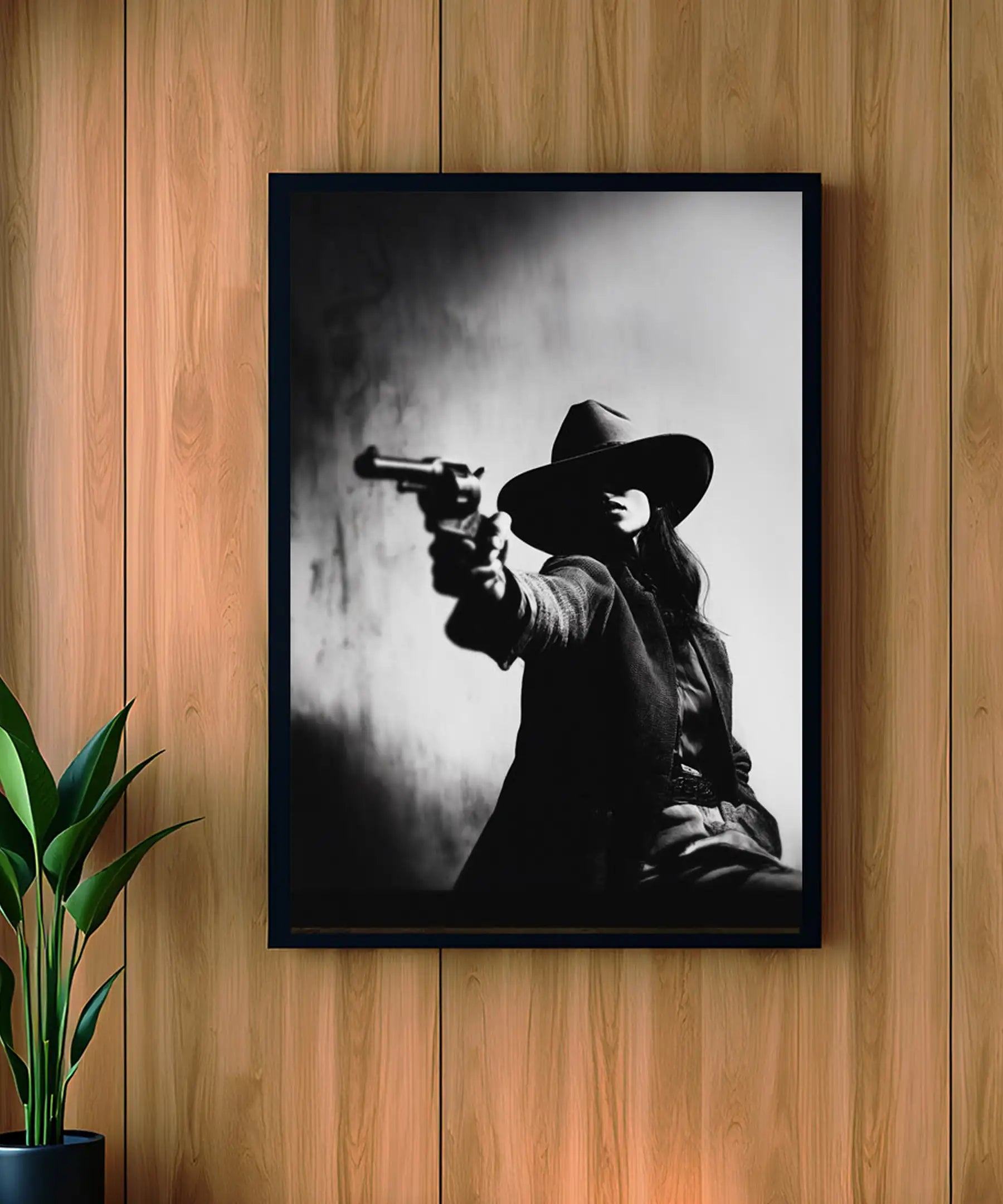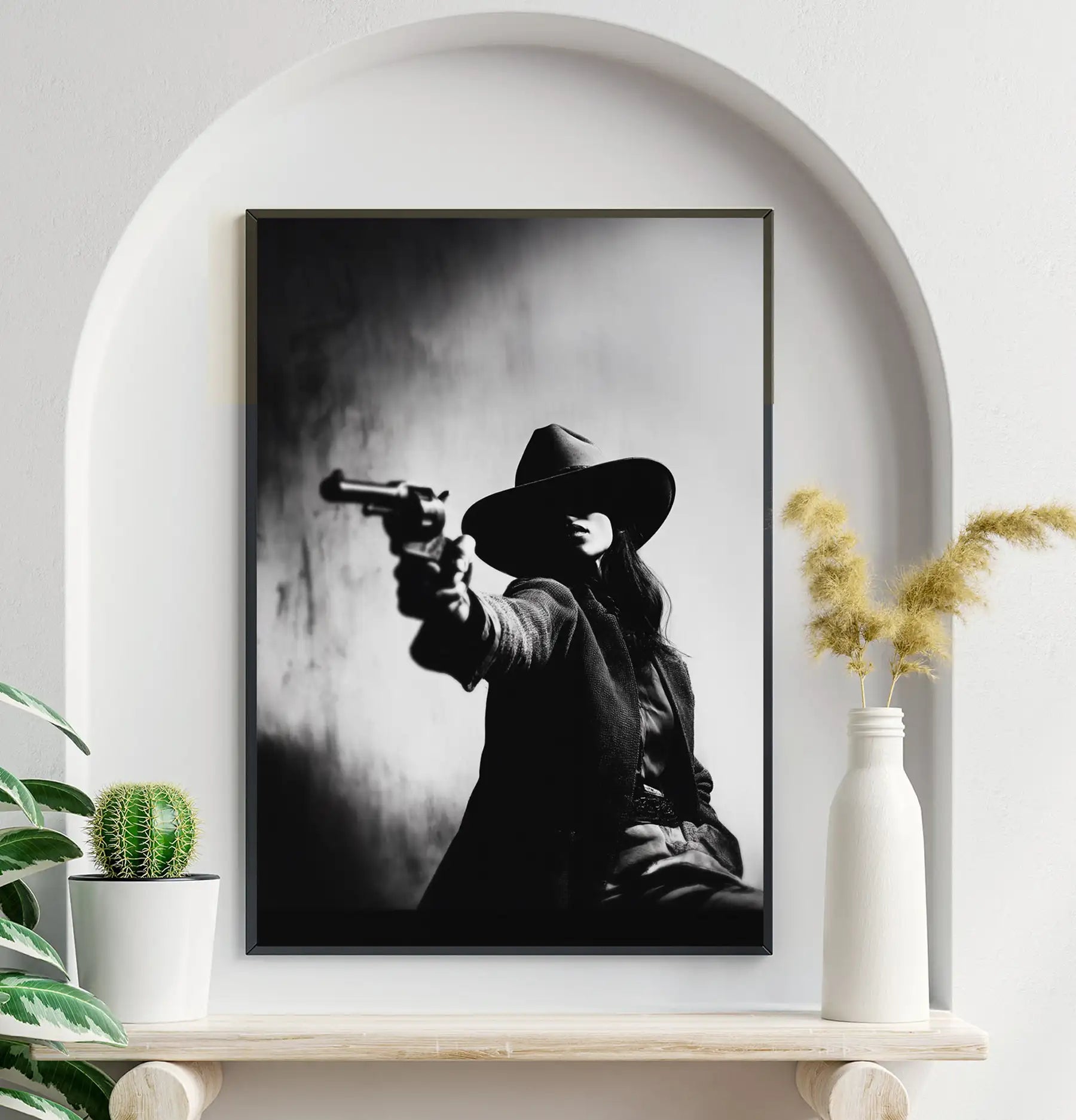 No apologies. No second chances. This striking black-and-white portrait captures a moment of raw power — a lone gunslinger with a quiet warning: don’t push your luck. Perfect for bold spaces and unapologetic souls. It’s fierce, cinematic, and entirely unforgettable.