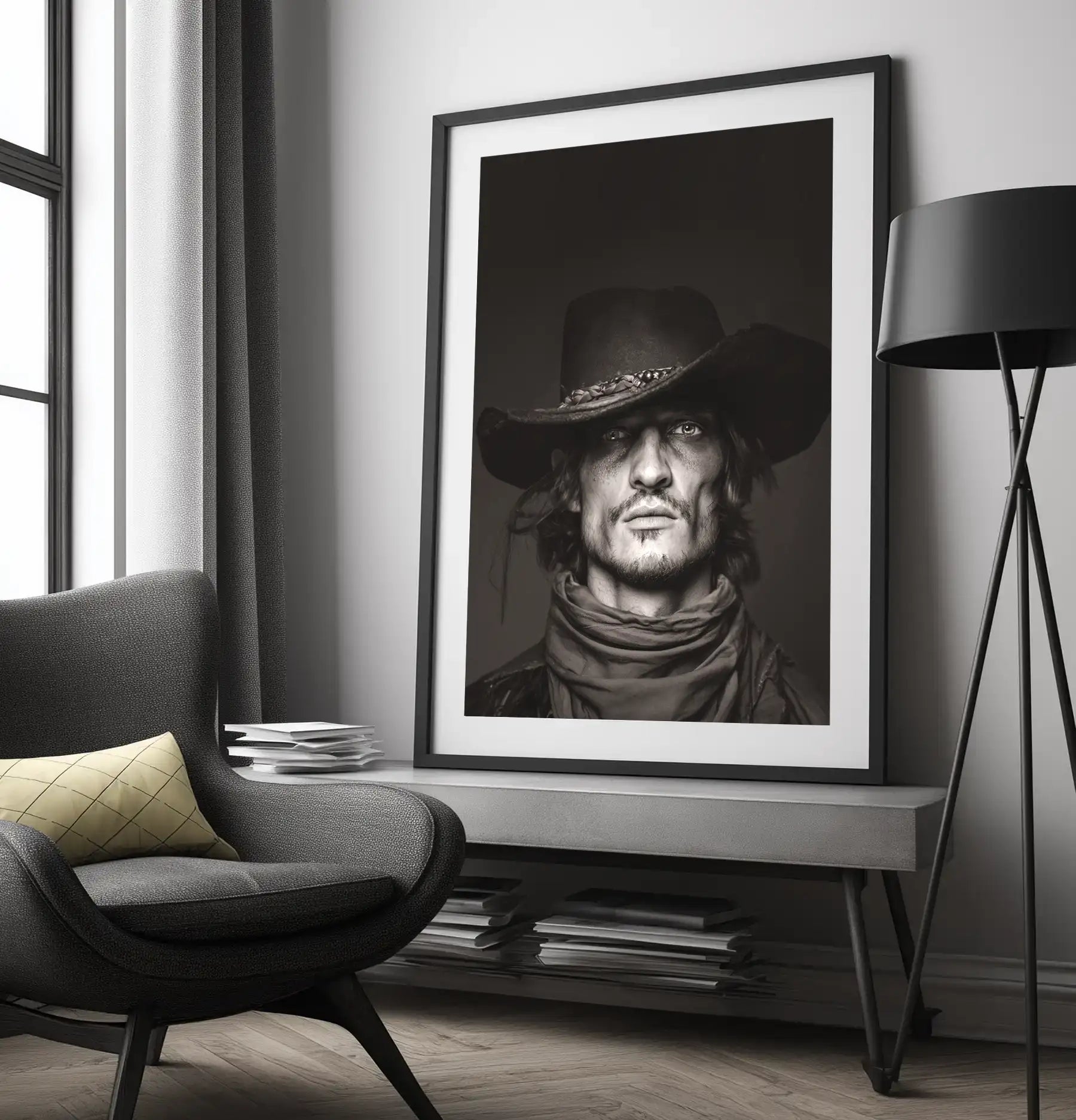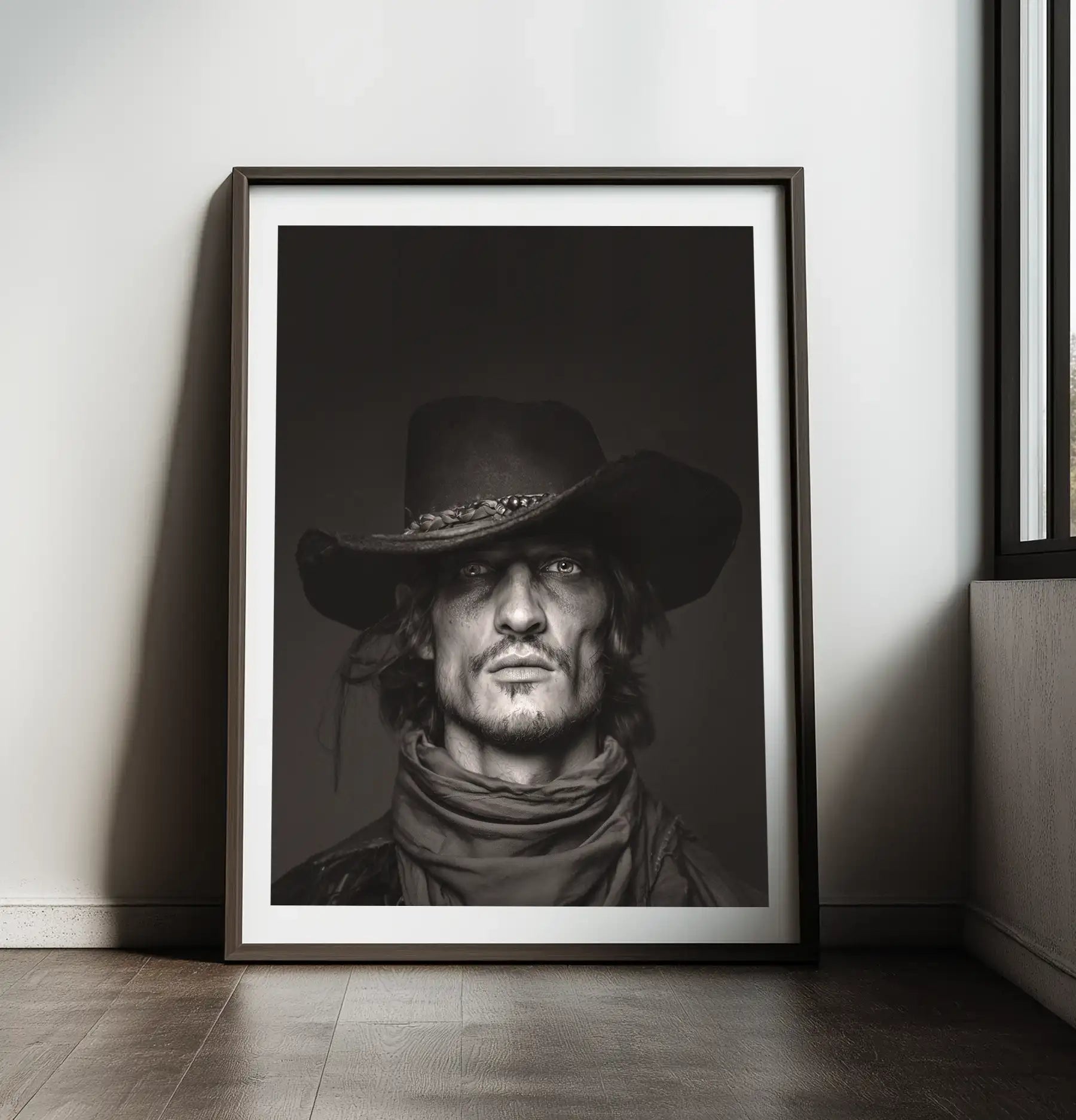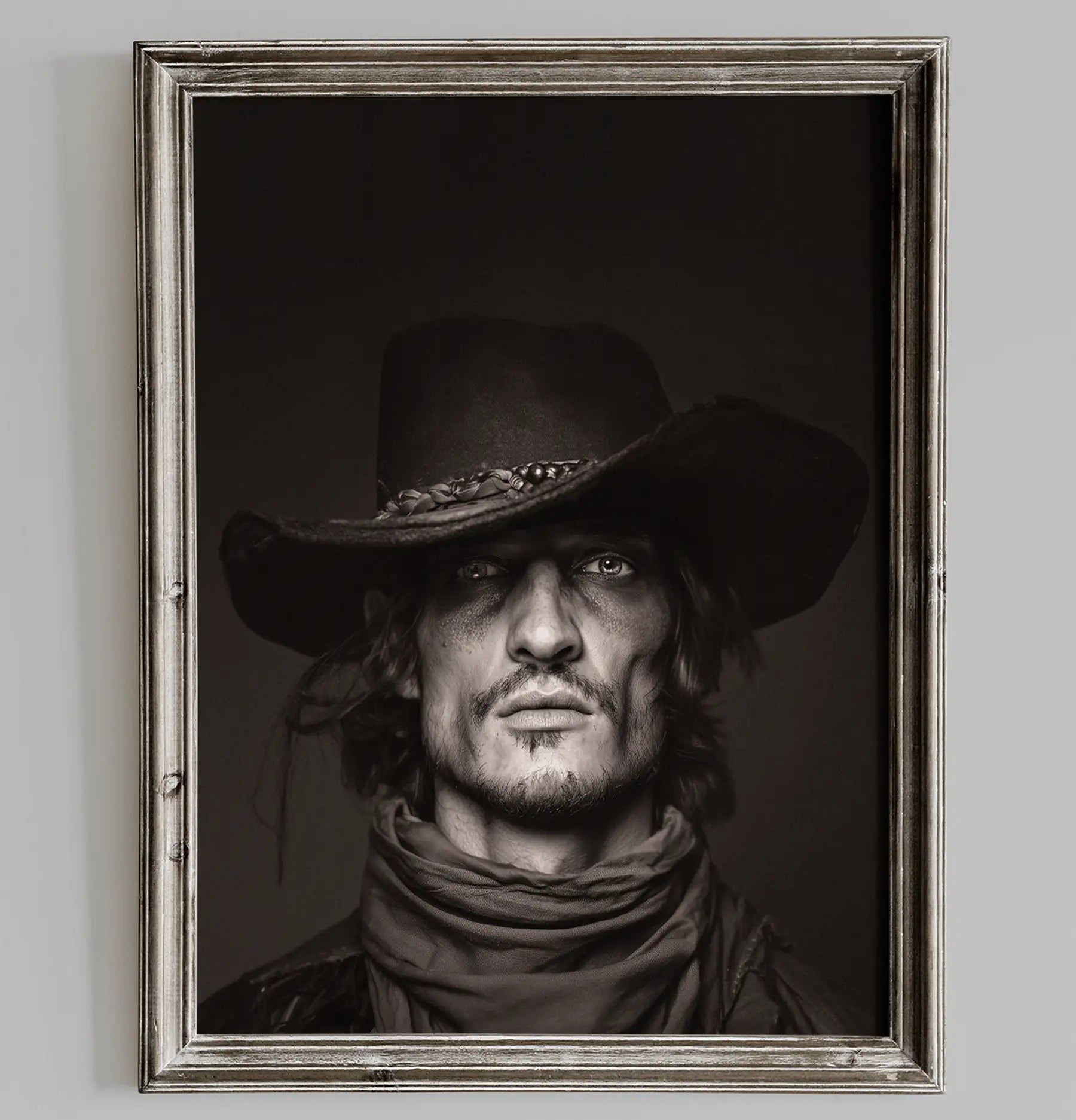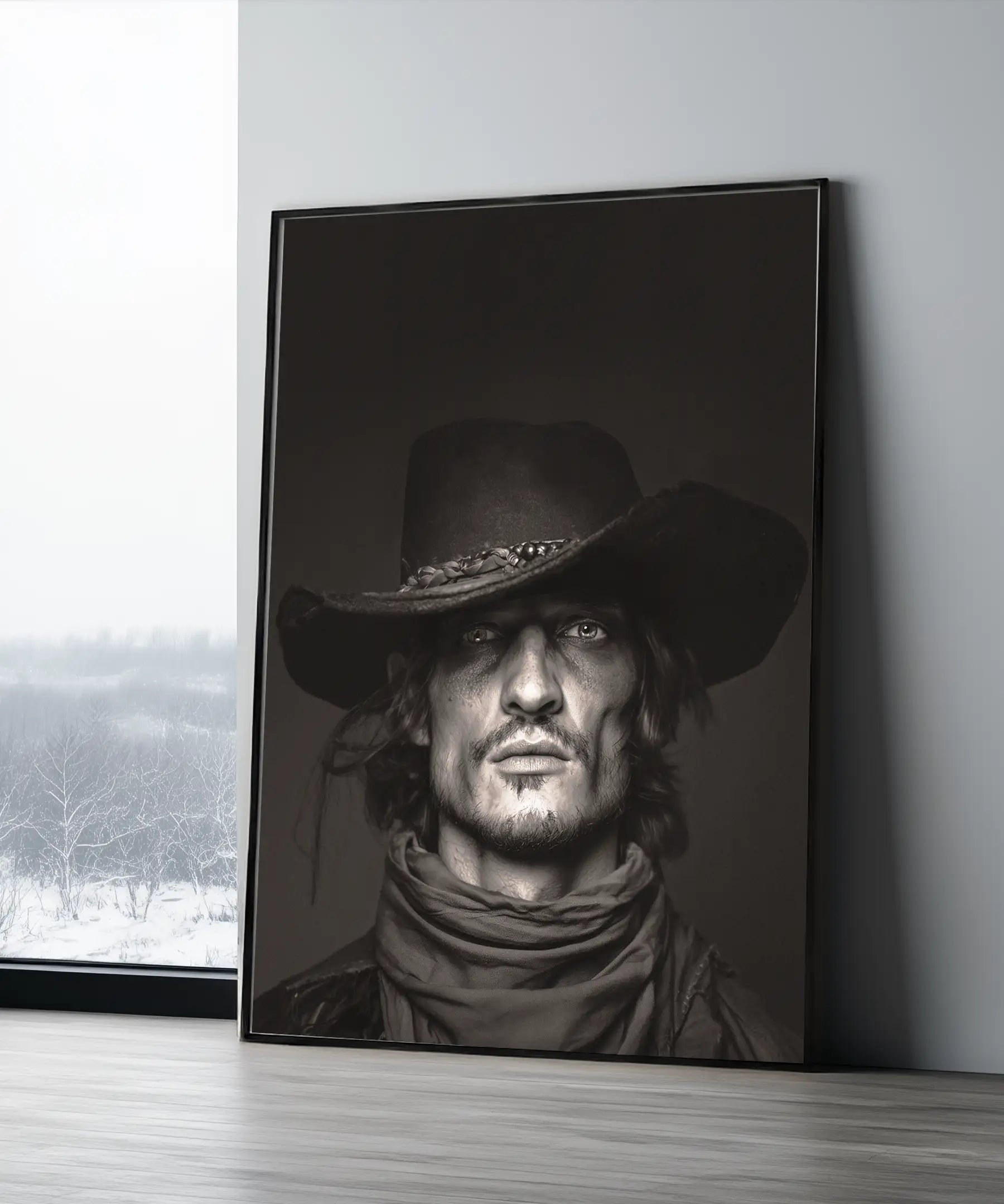 This ain't your average pretty-boy cowboy. He’s been through dust, doubt, and just enough whiskey to make peace with both. Rugged and intense, this portrait oozes quiet confidence and just a little menace. Printed with striking detail — perfect for spaces that like their wall art with a bit of snarl.