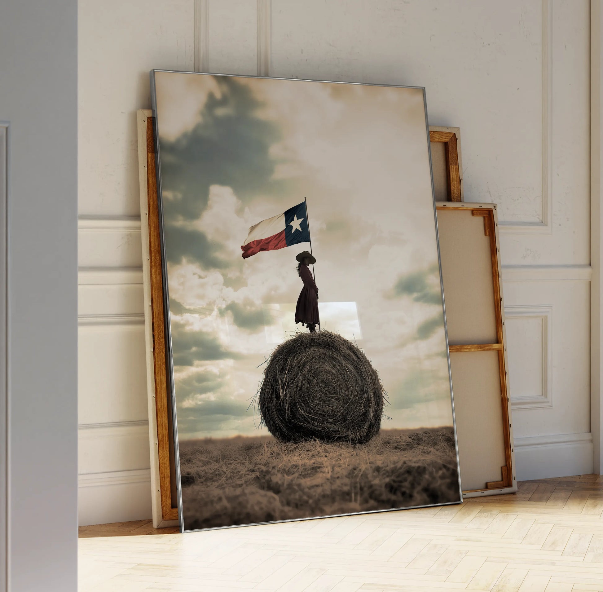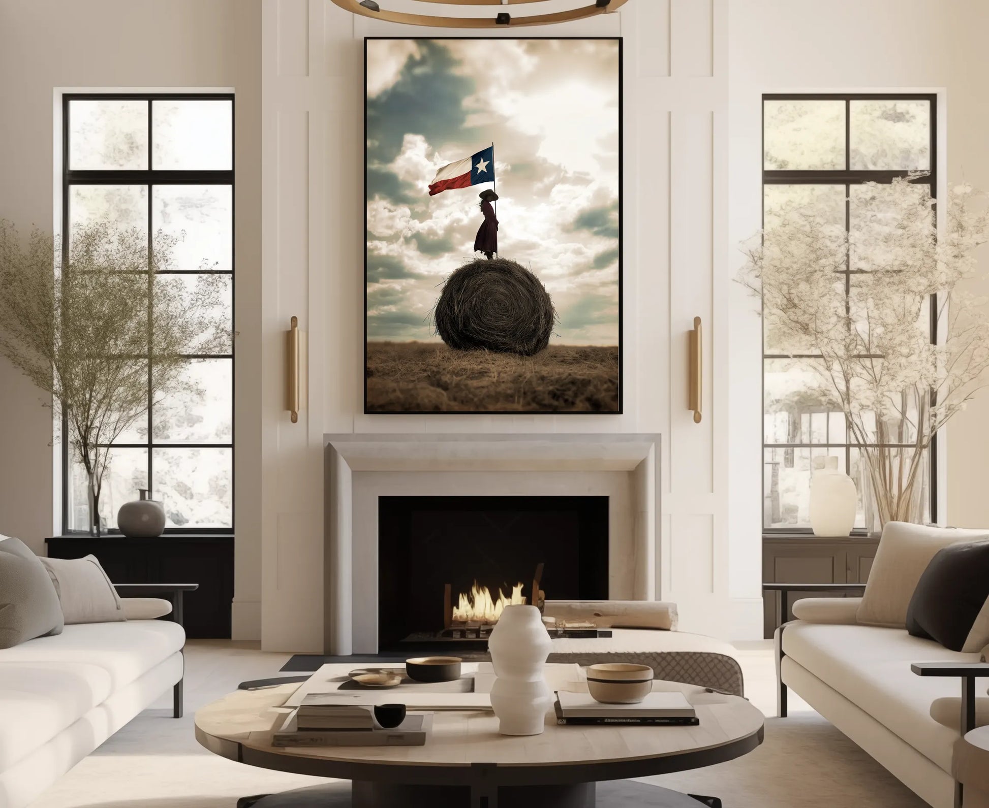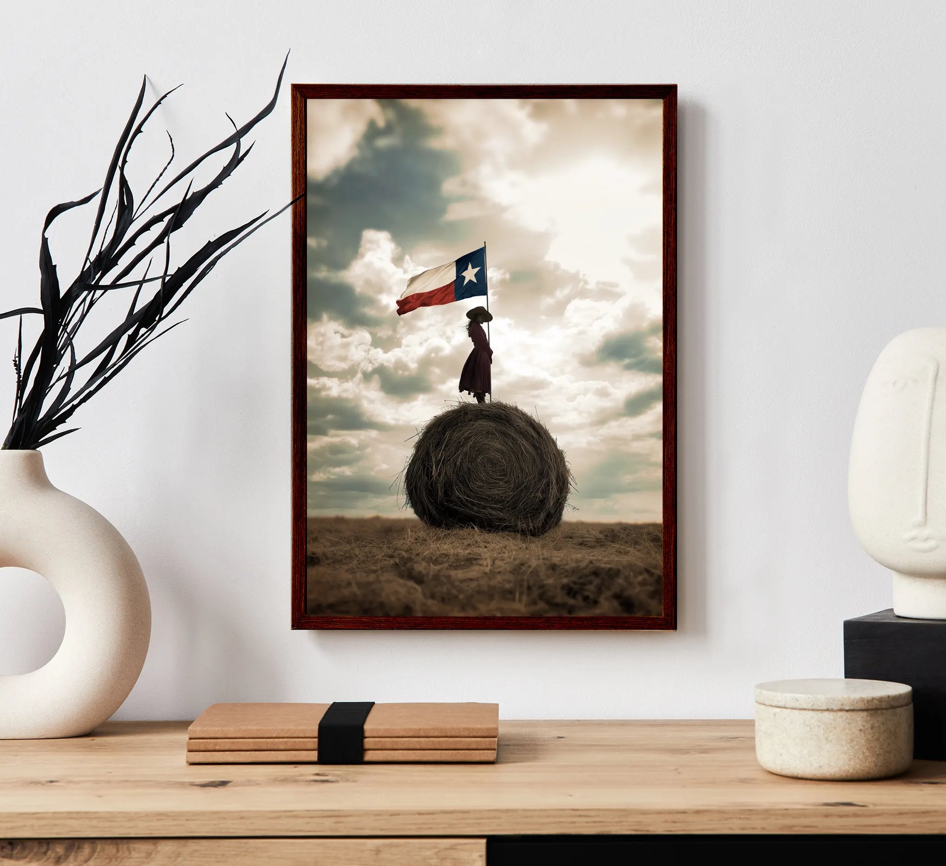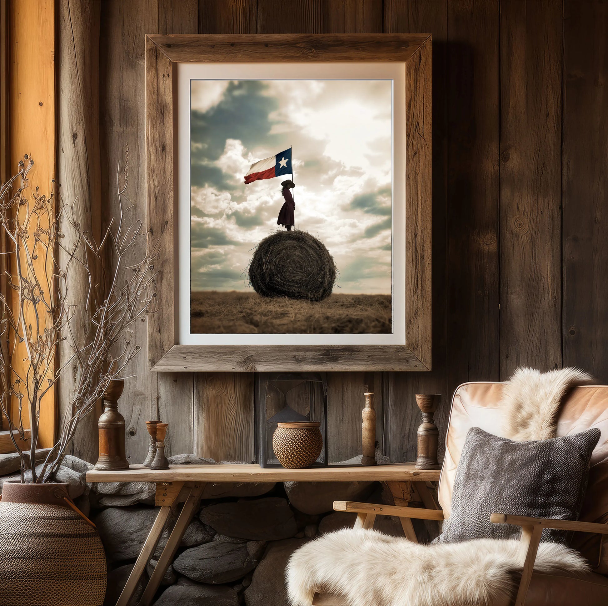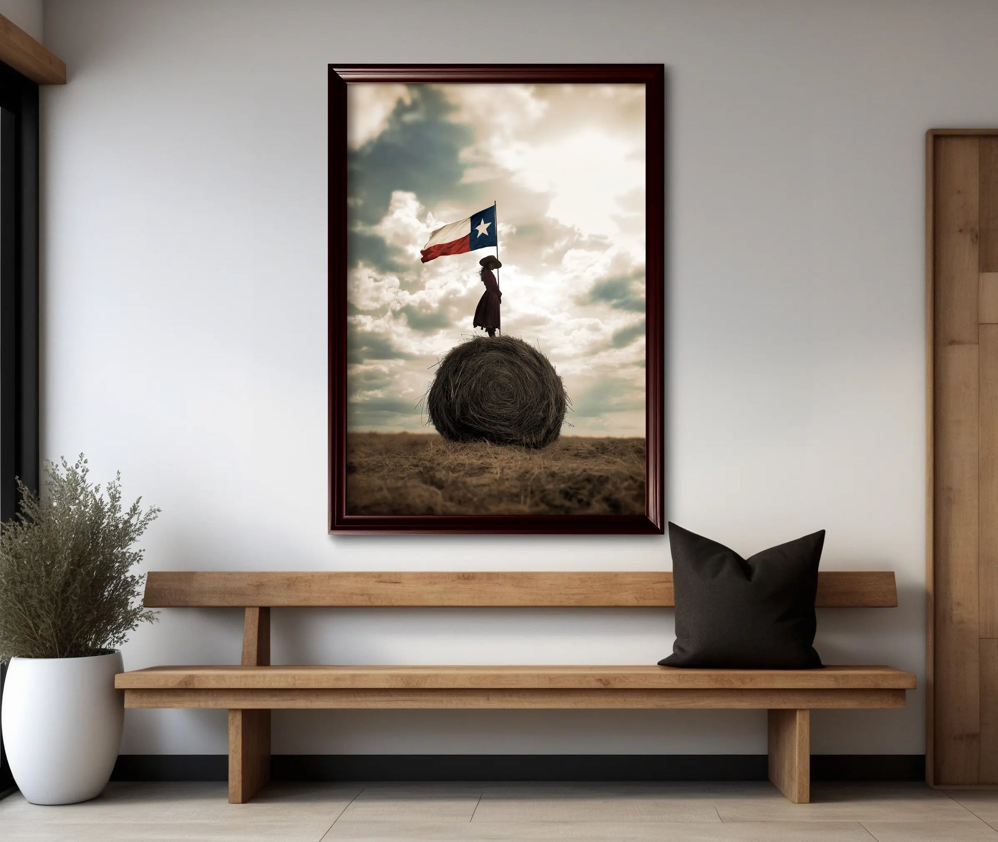 A striking tribute to Texas spirit, this print captures a proud cowgirl standing tall atop a hay bale, holding the Lone Star flag high against a dramatic sky. Powerful, poetic, and unmistakably Texan — this wall art makes a bold statement in any space. A favorite among collectors of Western prints and patriotic decor.