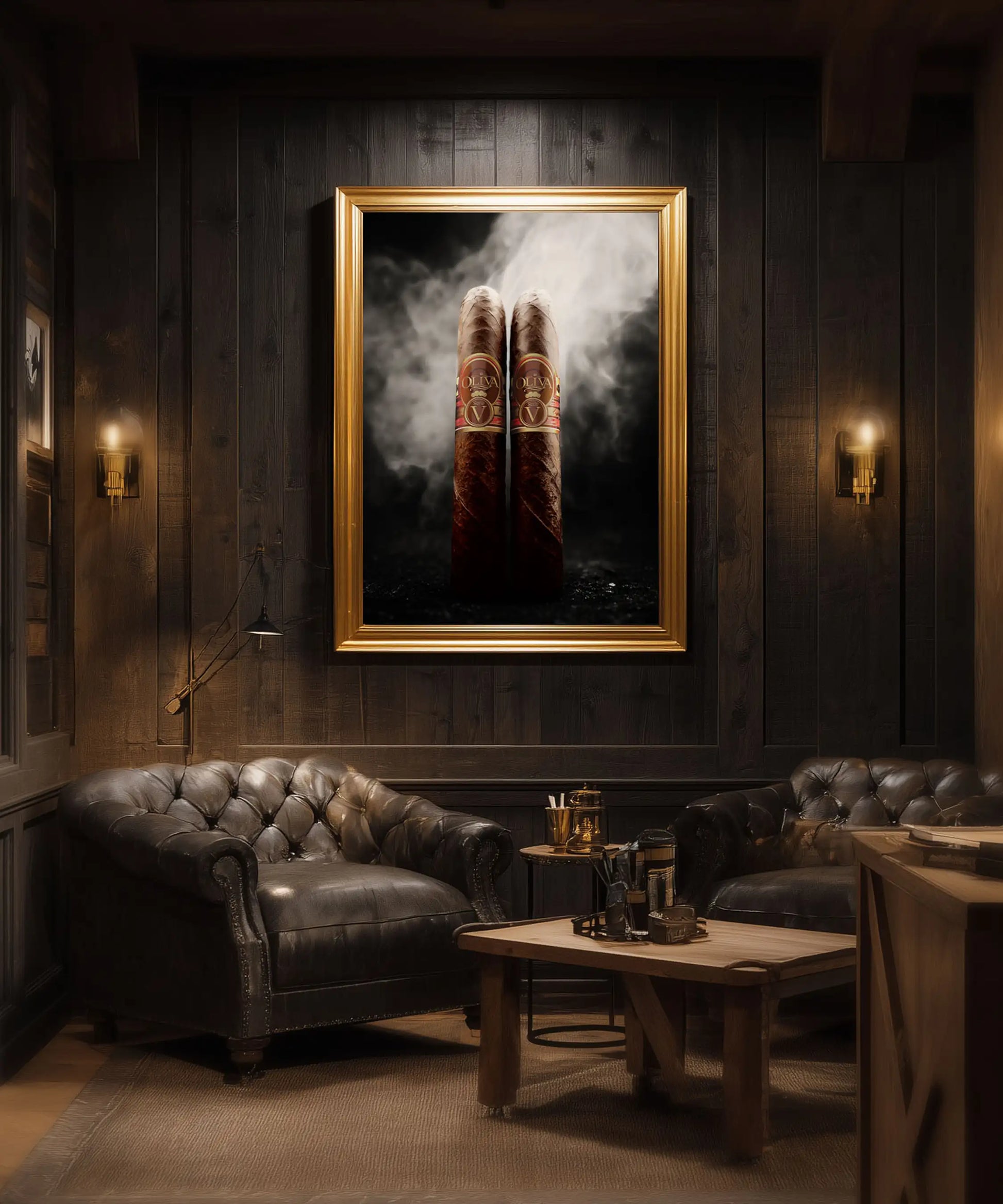 Double the bold. Double the trouble. This moody cigar print features a smokey duo of Oliva Serie V’s standing tall in rich detail. Perfect for cigar lounges, home bars, or any spot that needs a hit of grit and class. It’s a nod to good taste—and maybe bad habits.